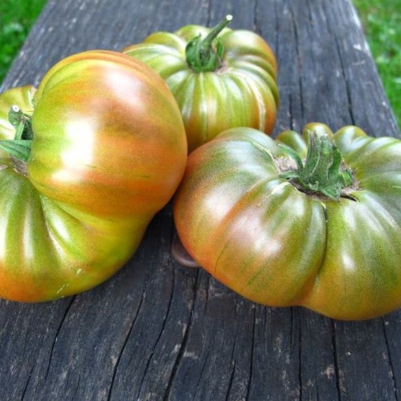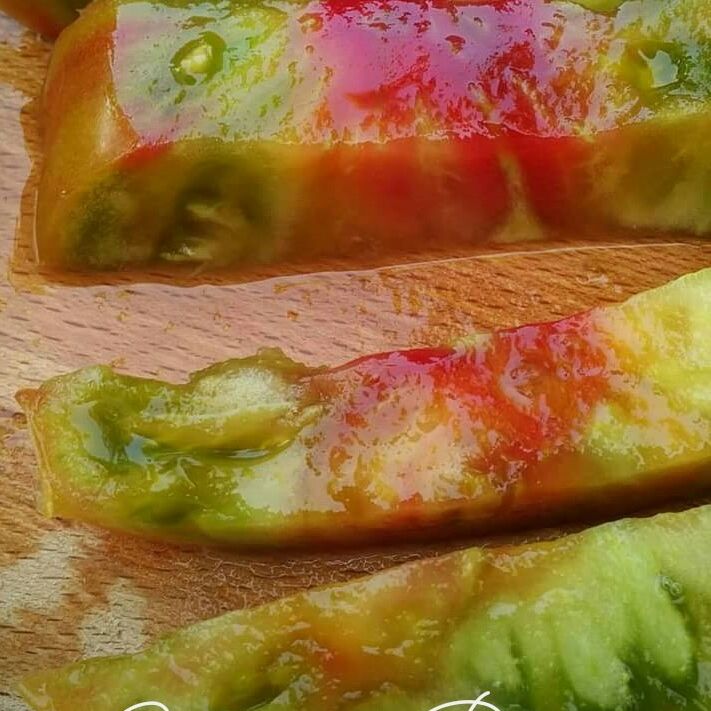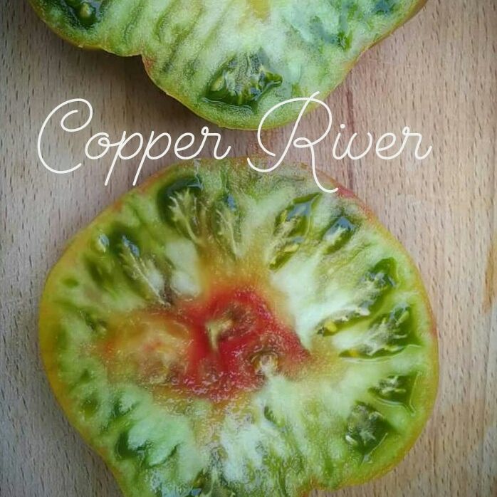 A real beauty queen of a tomato. Created by Lynn Brown of Napa Valley, CA. Stunning when cut. A thin skinned, copper color when ripe with light yellow blushing and a bright pink interior. A show stopper on a tomato platter. Perfect, crack free fruit with a light, fresh fruity flavor. Regular Leaf Indeterminate Mid Season