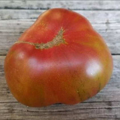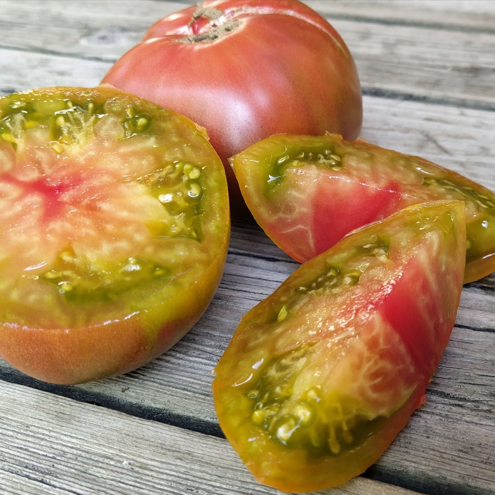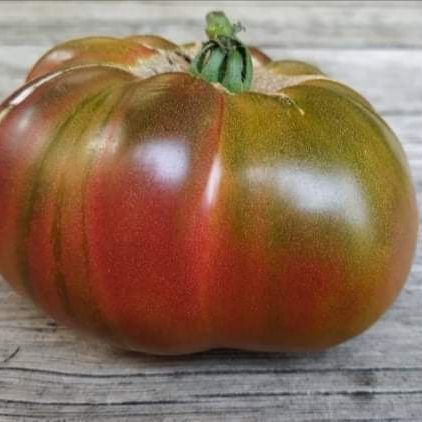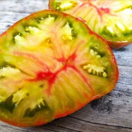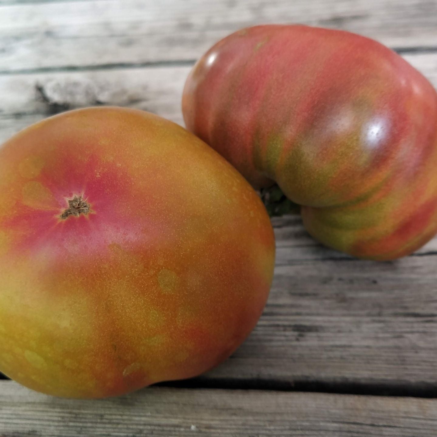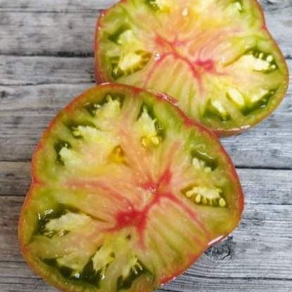 It was introduced in the SSE 2003 Yearbook by the late Belgian seed preservationist, Luc Fichot. These are very large, tri-colored beefsteaks that can reach up to 2 lbs ocassionally. Most average in the 1 lb range. The interior is mottled with red, green and pink. Very meaty slices that hold up well. The skin is a red, olive green , purple color. A stunning tomato to say the least. The taste is sweet yet mild.
