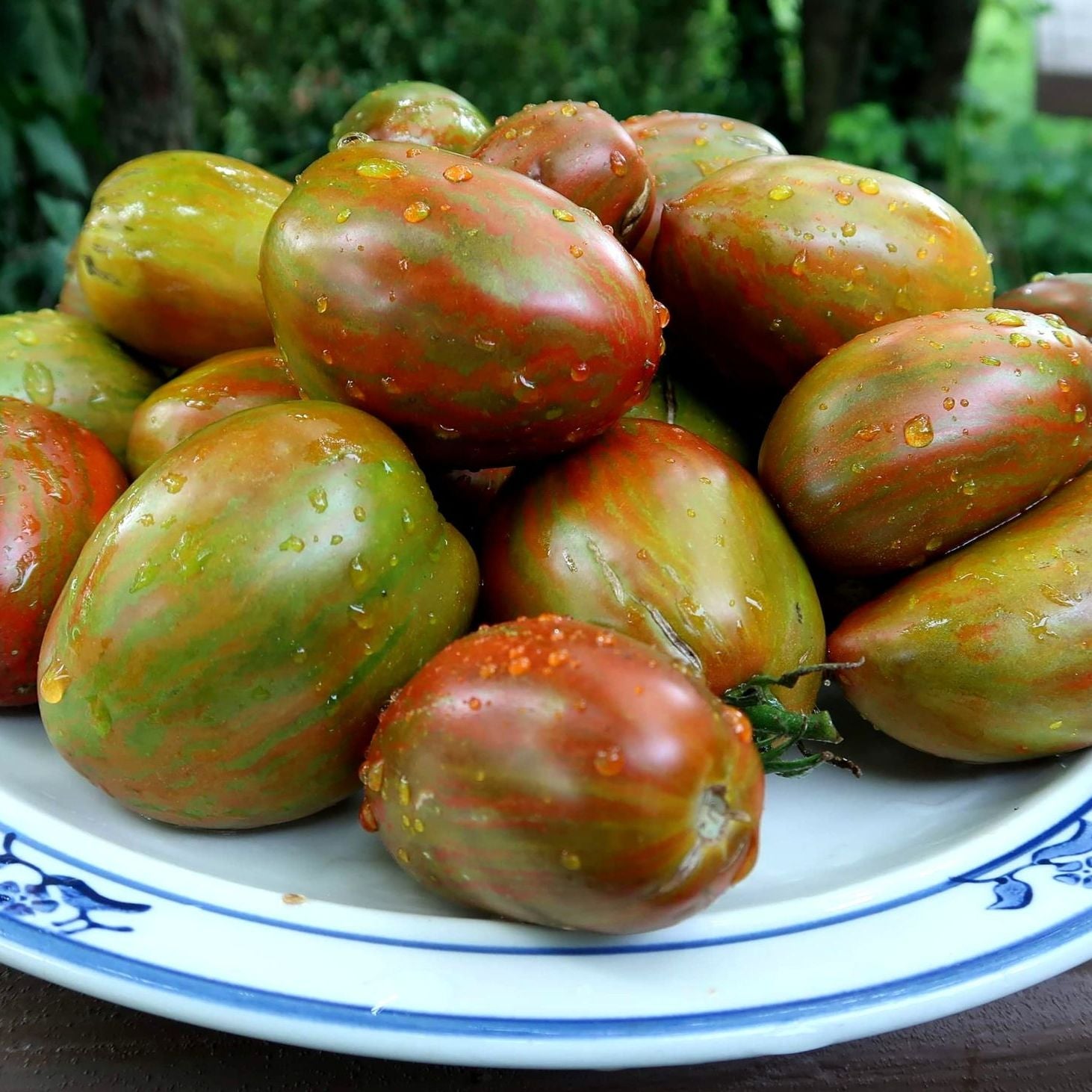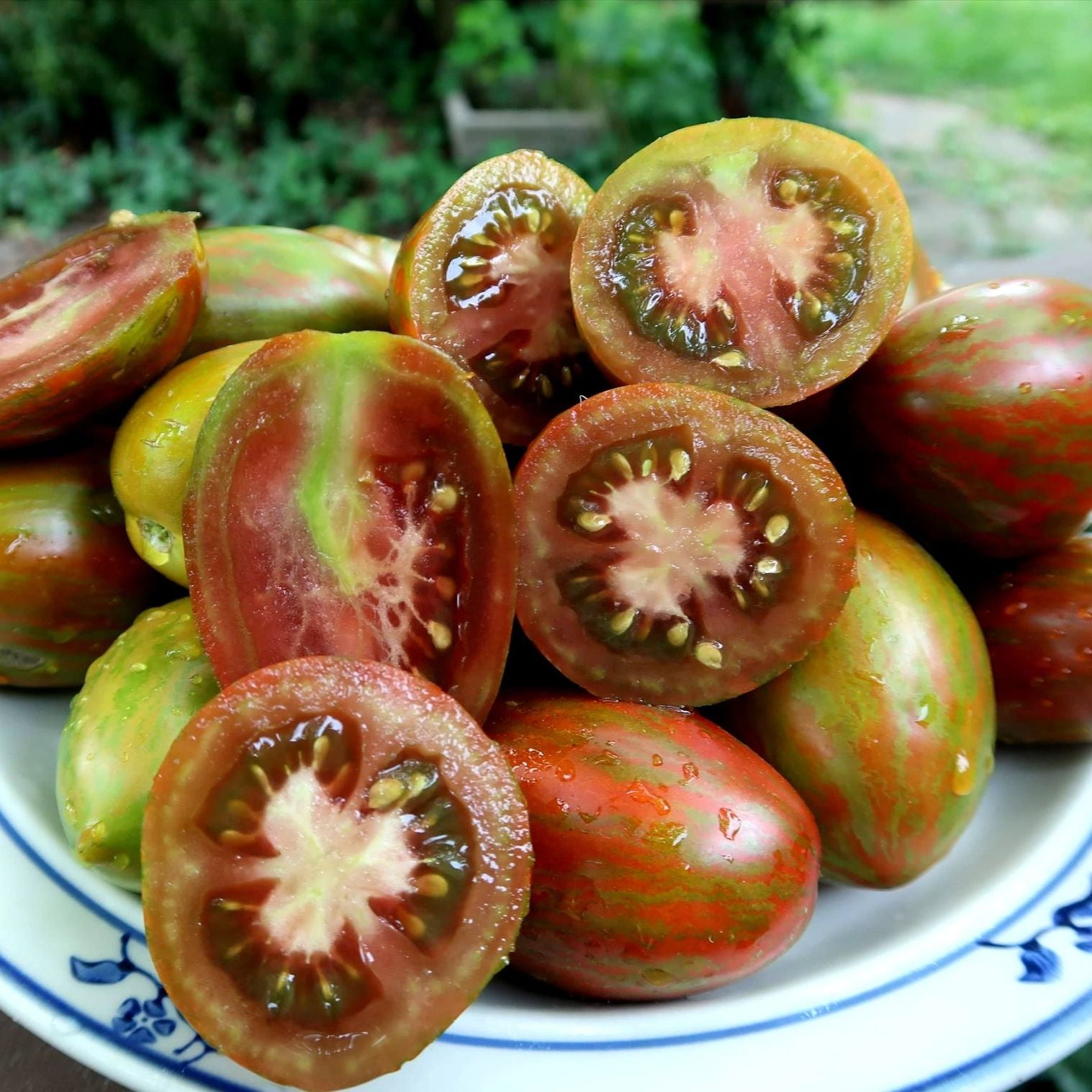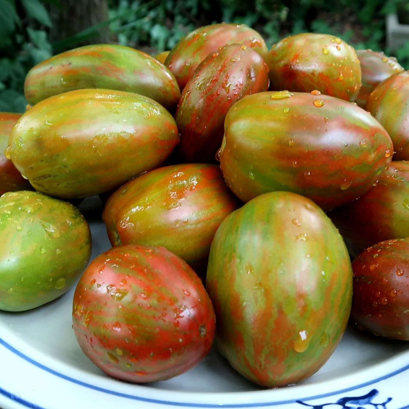 This variety from the Dwarf Project, only grow to about 2-3ft tall. The fruit are plum shaped paste type tomatoes. A deep red with green striping. Can be used in salads or fresh eating. Very juicy. The flavor is mild but intensifies if cooked like most paste tomatoes. Very productive for a dwarf variety.