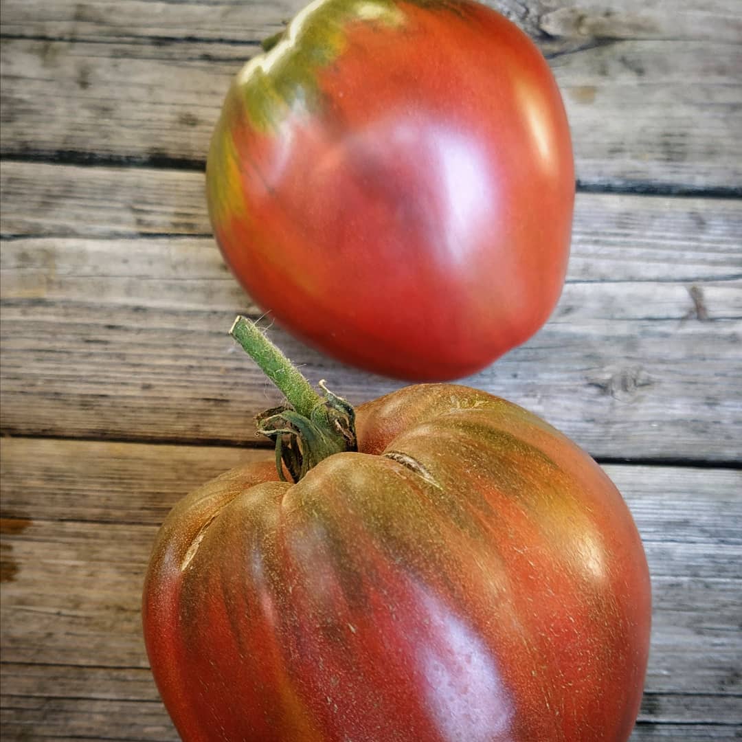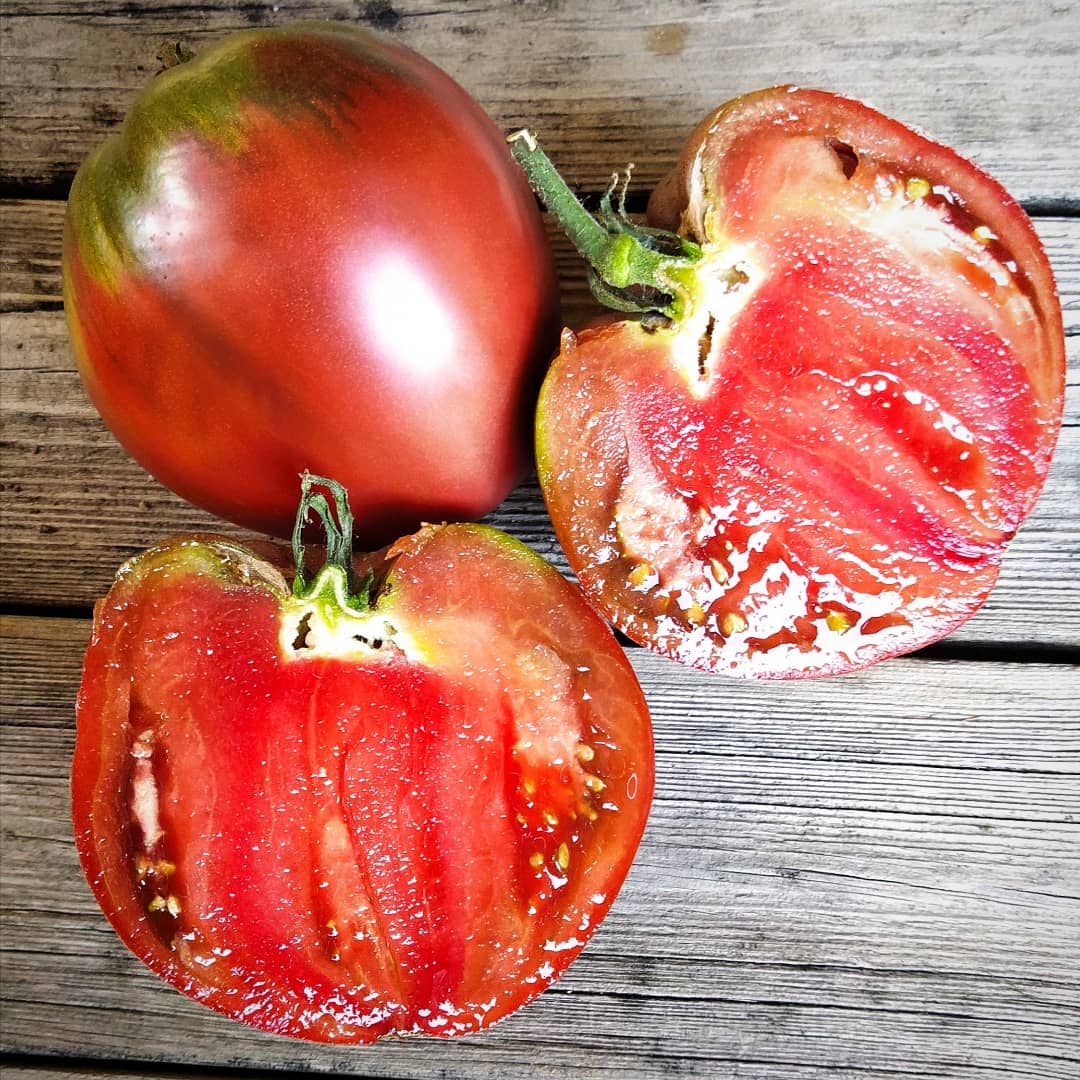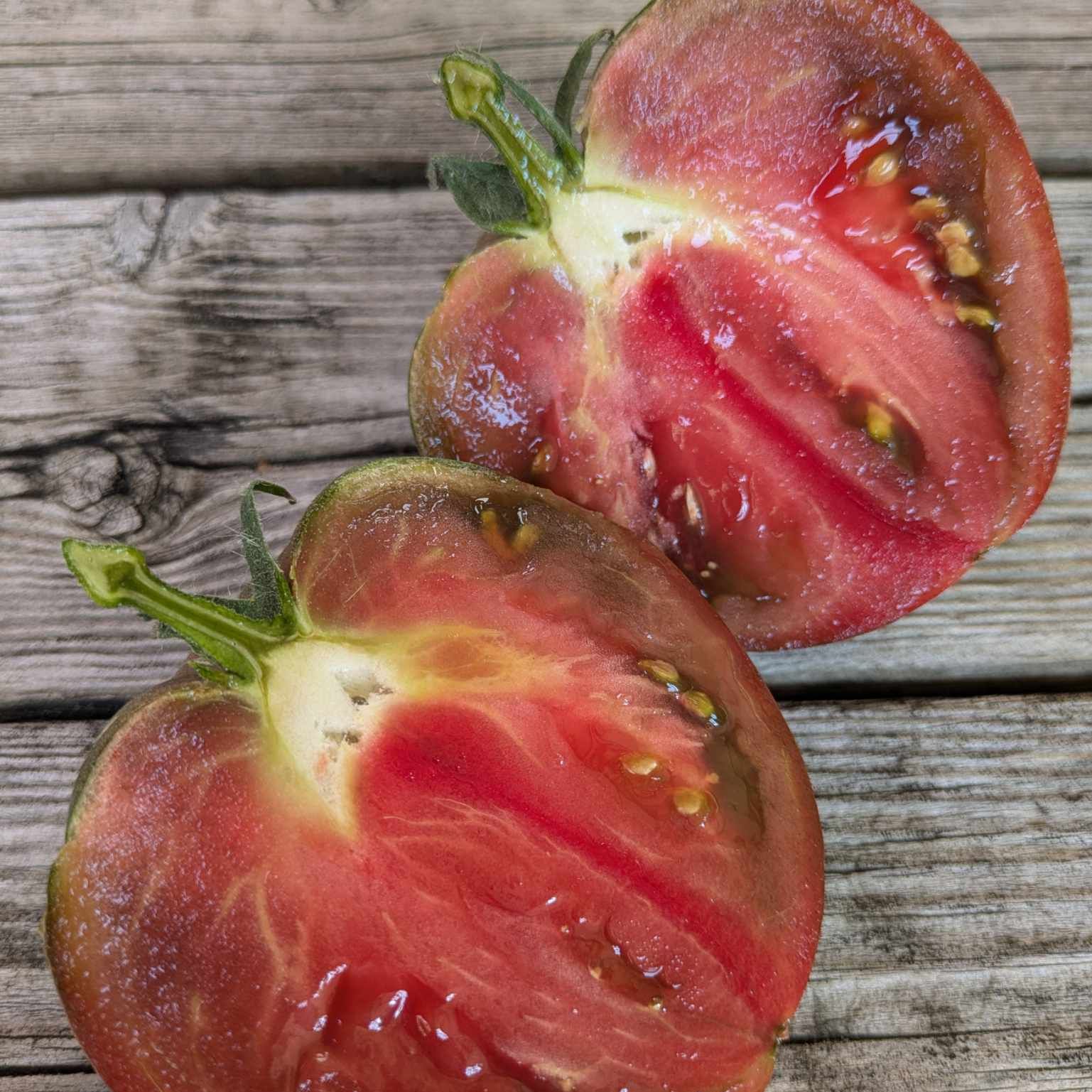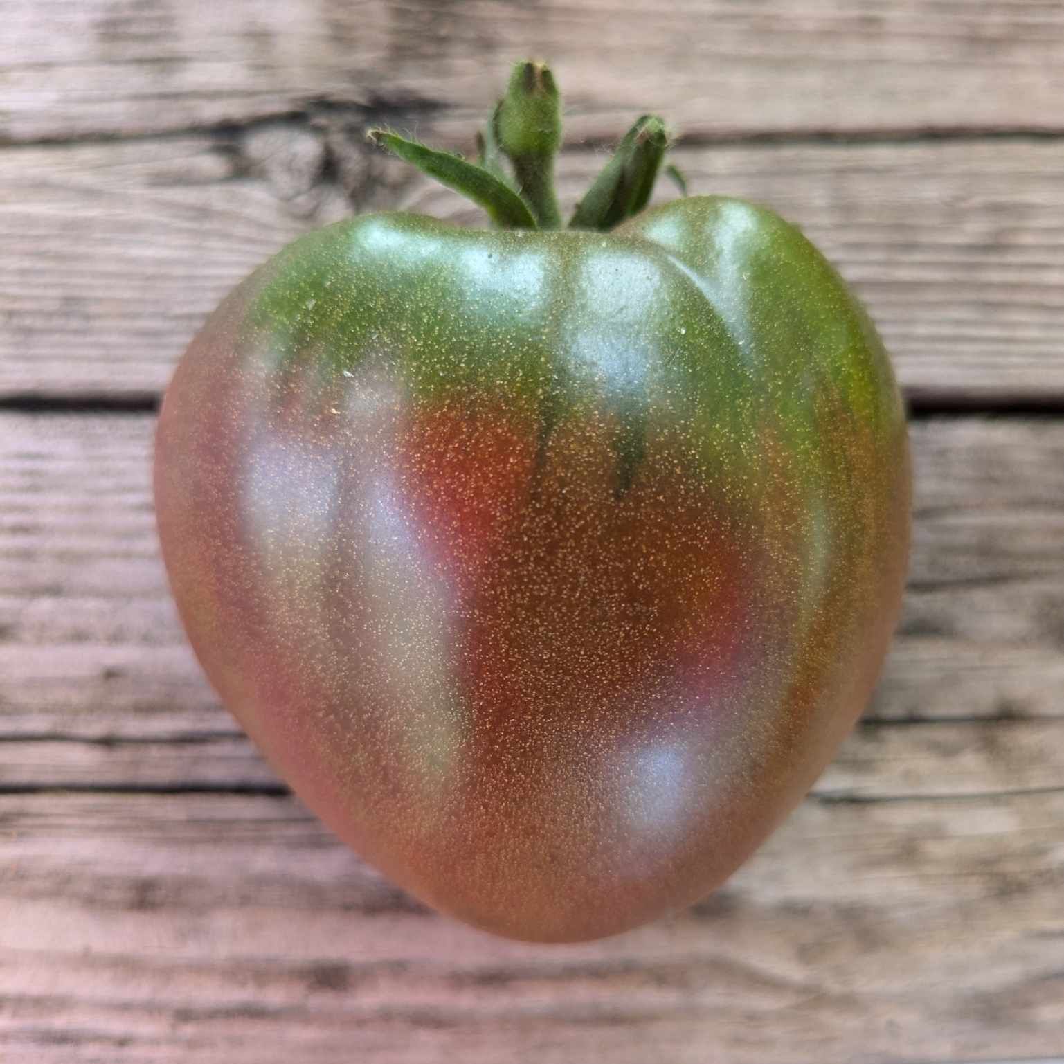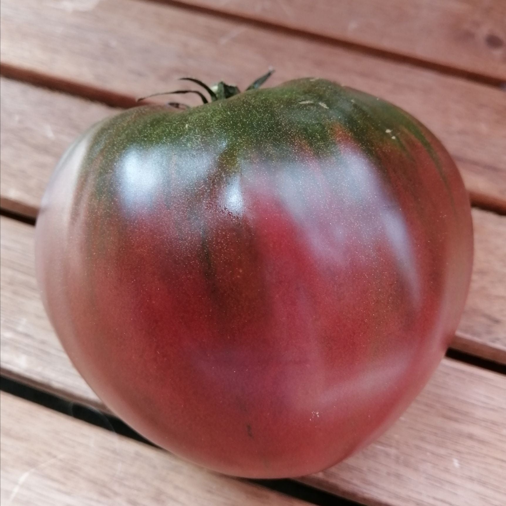 So we know this is a tomato that tastes like an heirloom. It did not have a variety name attached as most heirlooms so we think it was a newer, commercial variety they wanted to compare to an heirloom. We've grown it again from saved seed and it's a beauty. Thin skinned, very fat flesh with low seed count. Excellent paste tomato for sauce. It sits well for an extended period of days. The taste is sweeter when cooked. Eaten raw it is mild and meaty. Very purple with the typical dark shoulders. Barely any core to this one. We are calling it Blackjack for lack of a name attached. ** ONE PACK PER CUSTOMER Indeterminate Regular Leaf Early-Mid Season