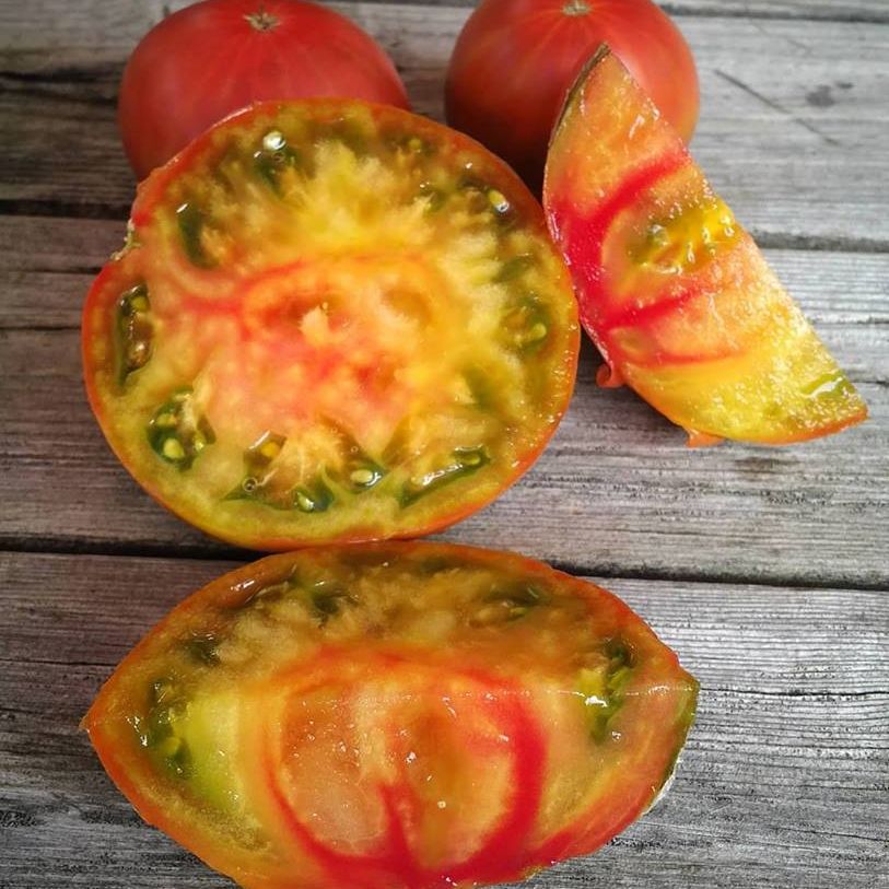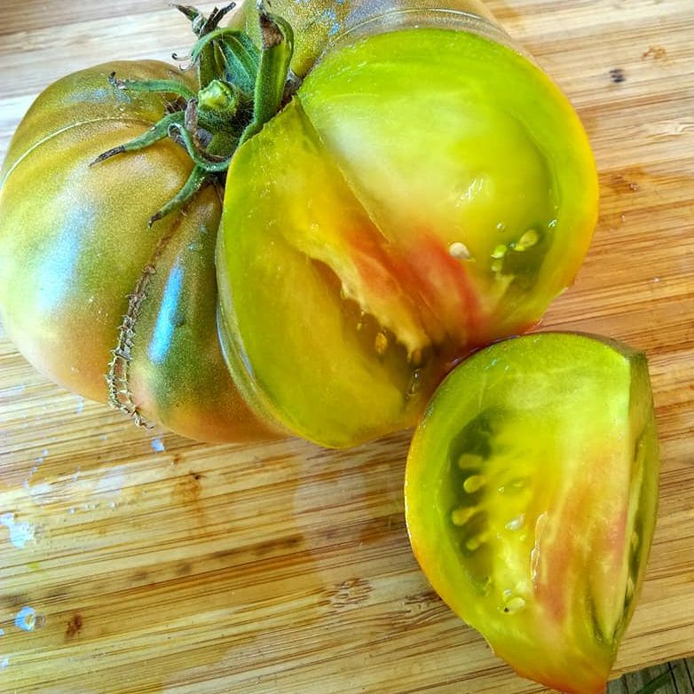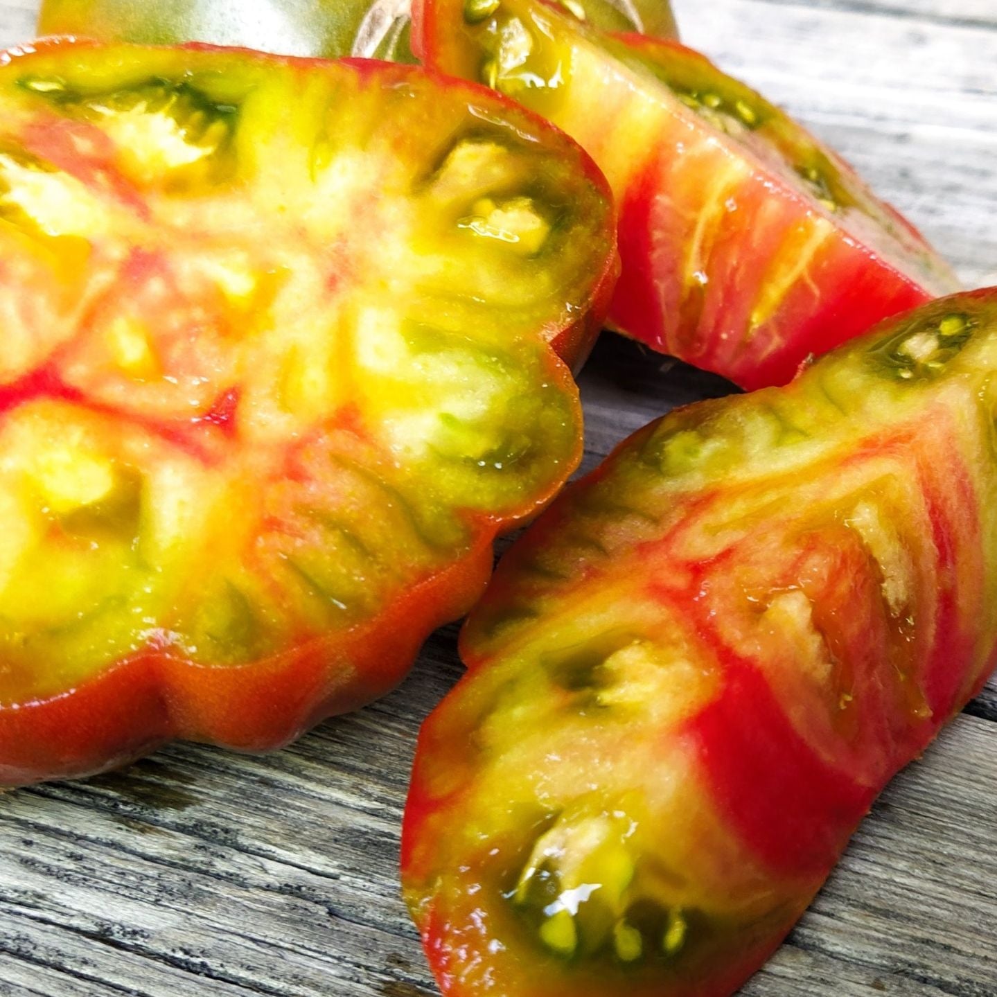 Captain Lucky -10+ Organically grown seeds This gorgeous beauty comes from Millard Murdock. An accidental cross of Lucky Cross x an unknown. Sliced open it displays stunning shades of green, pink and yellow. It's almost too pretty to eat. Amazing sweet flavor and very productive. Withstands heat and drought well. No catfacing or cracking on this one. Impress your friends with this artistic tomato! Also check out Captain Lucky White by Millard Captain Lucky White Indeterminate Potato Leaf Mid-Late Season