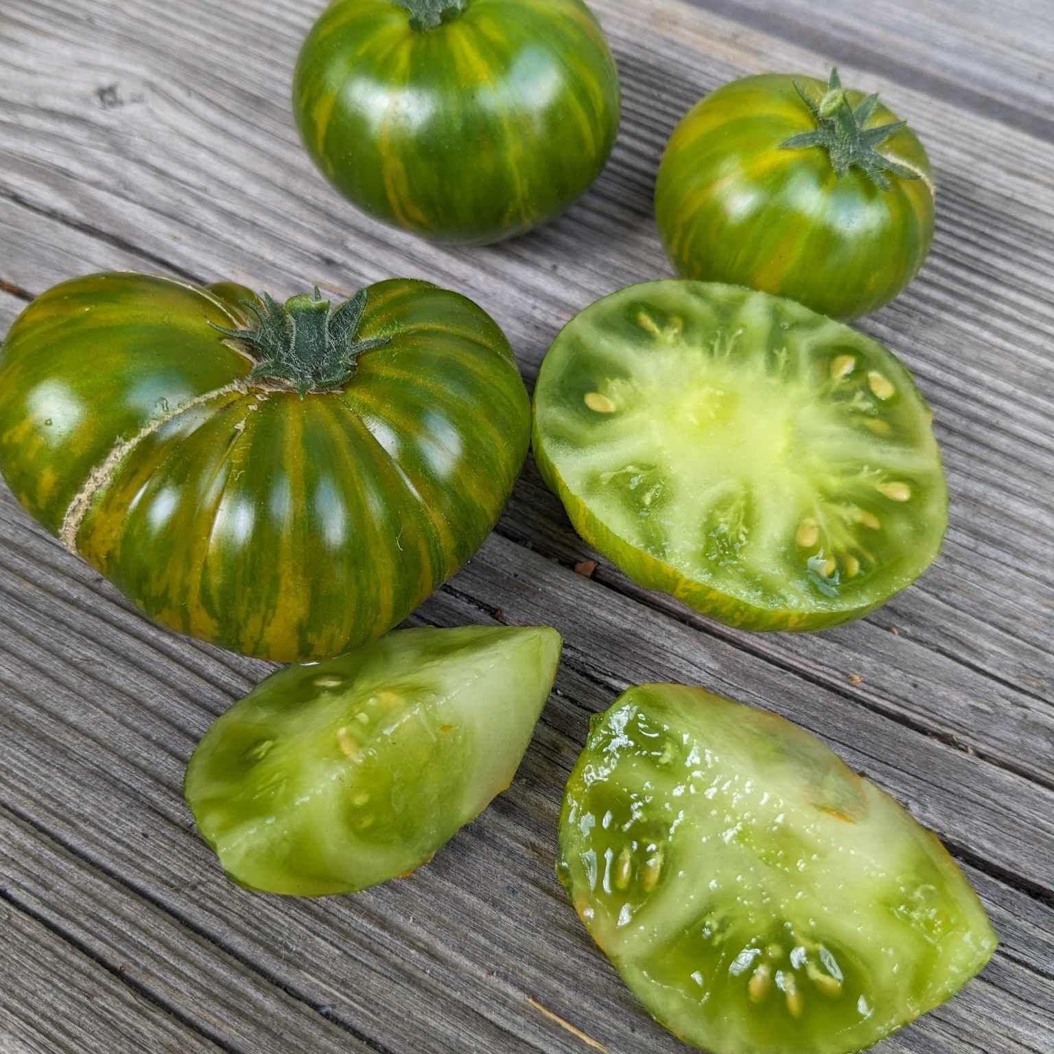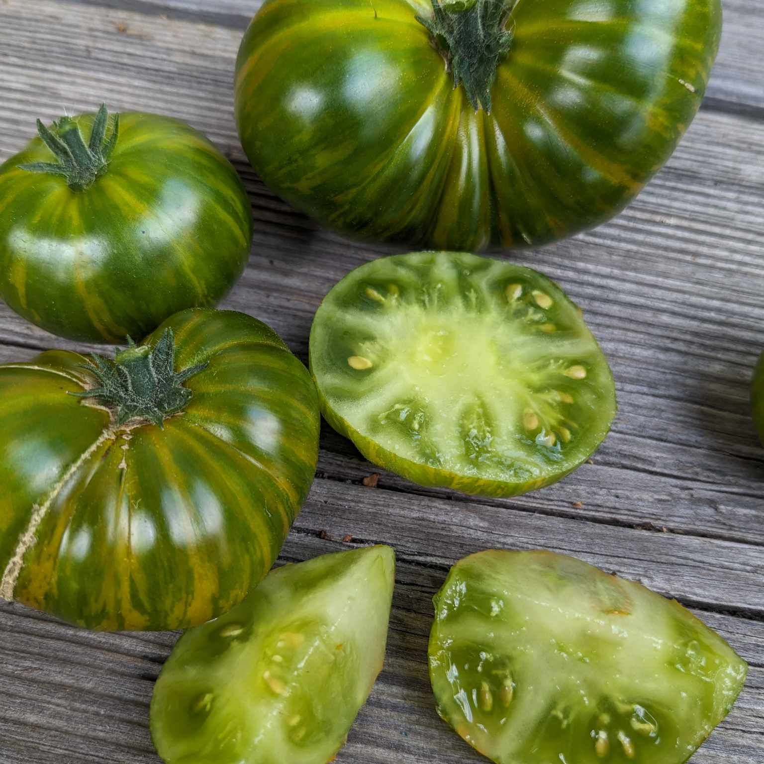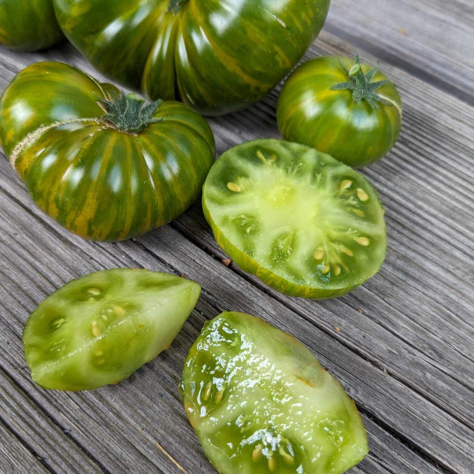 Beautiful jade green tomatoes with yellow striping. We were quite surprised at the sweetness with this one. Really impressive with flavor and the stunning appearance. Grows clusters of fruits and very productive. Beautiful and tasty. Perfect for salad, Caprese platters, or just eating solo with salt.