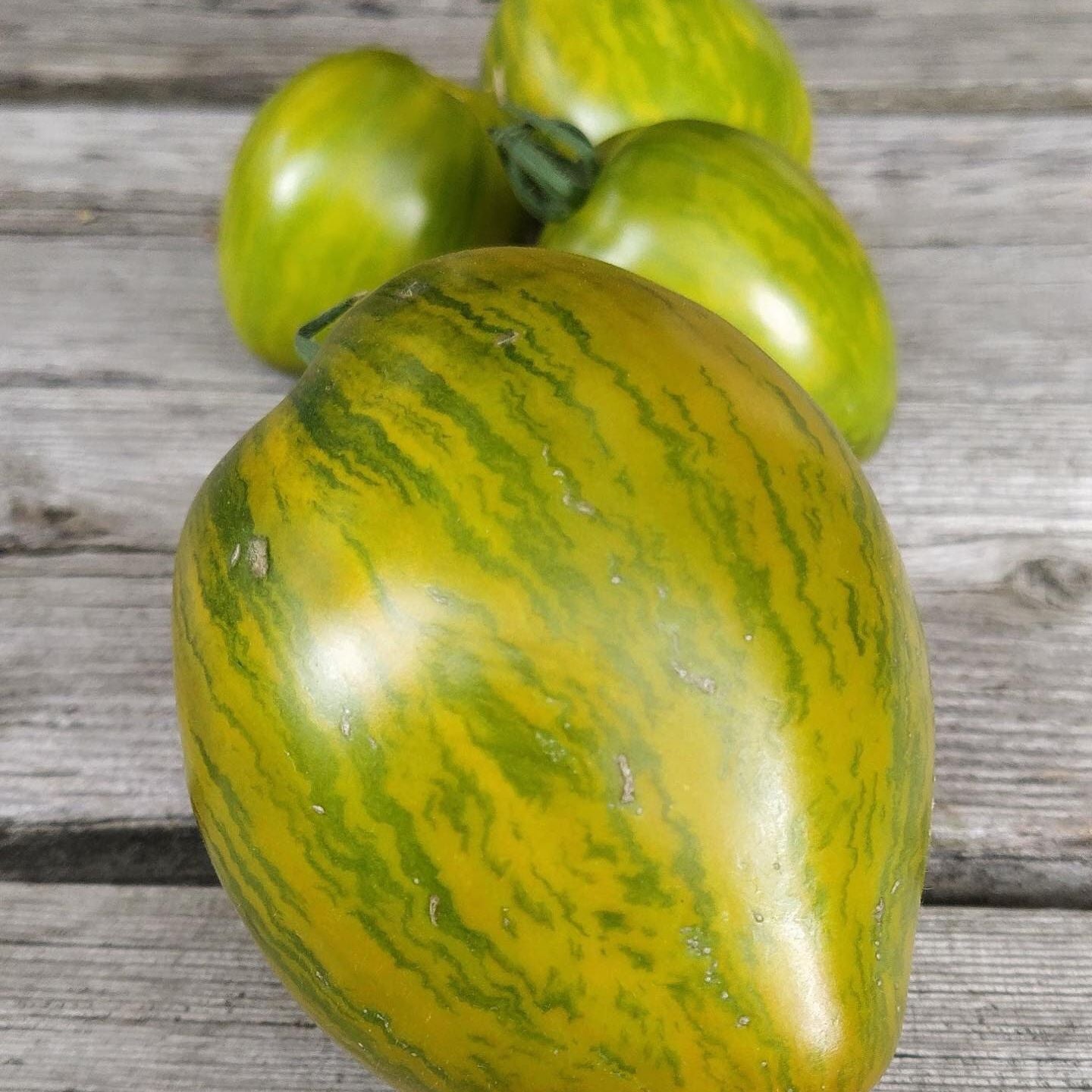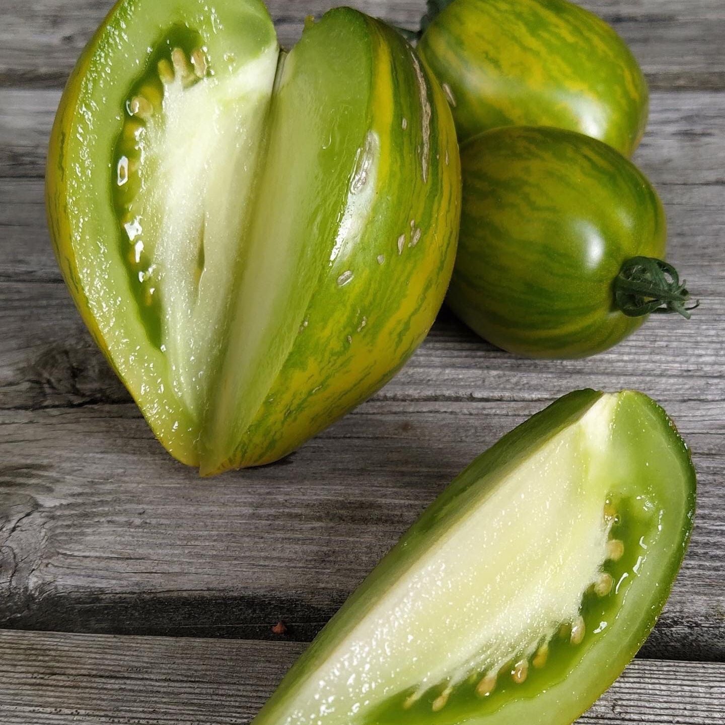 This dwarf plant produces tons of elongated plum shaped fruits. Dark green skin with light green stripes with green flesh. Most are about 6 oz. I can imagine this making a green ketchup. Juicy and flavorful. Adds color to a tomato salad and perfect for those growing with limited space