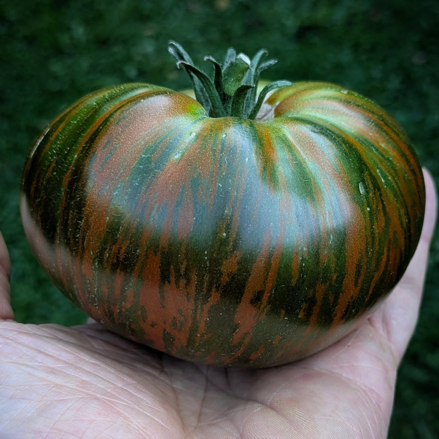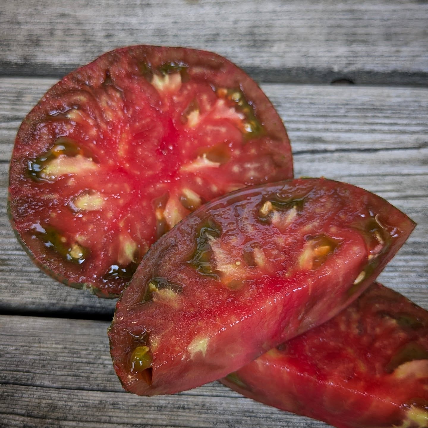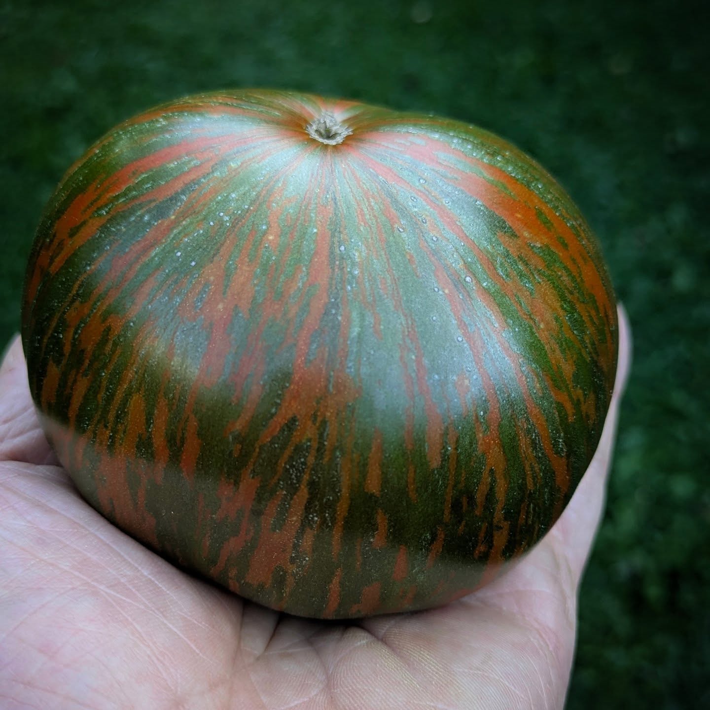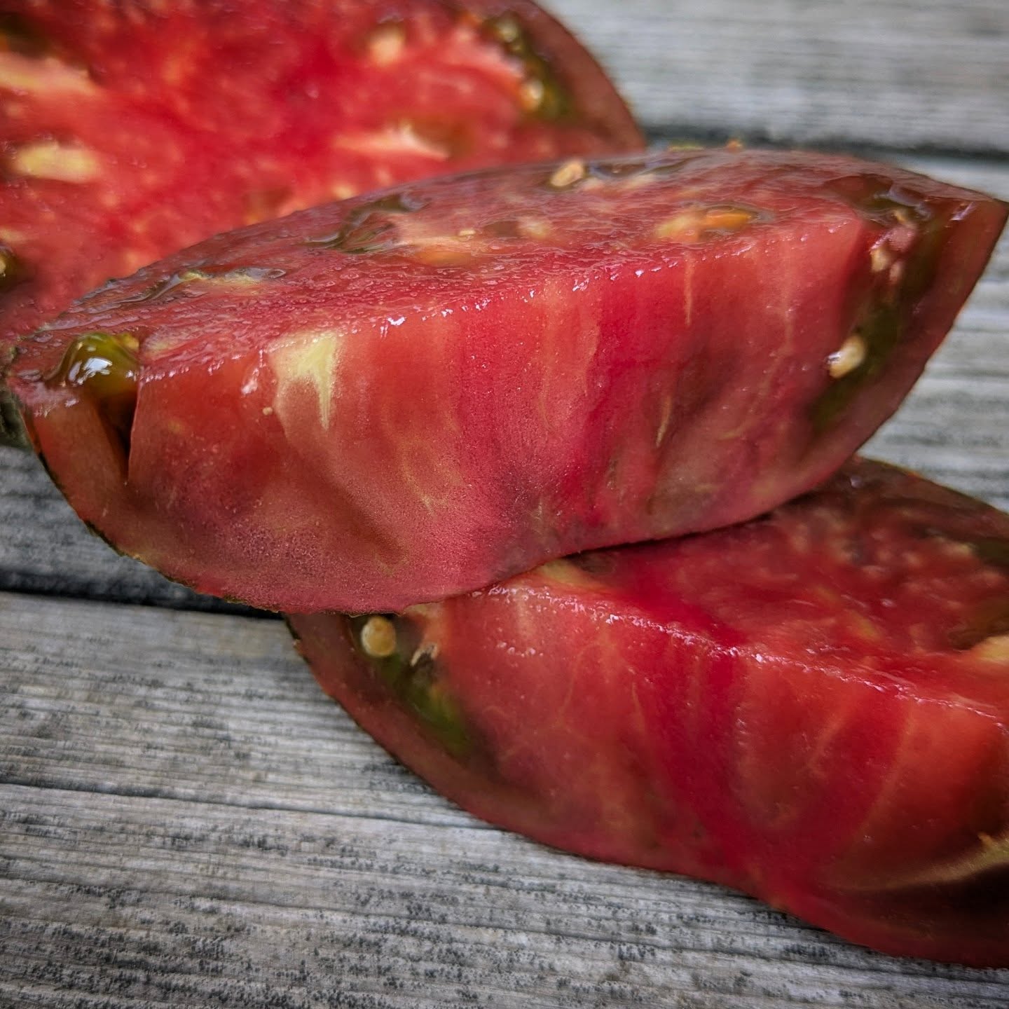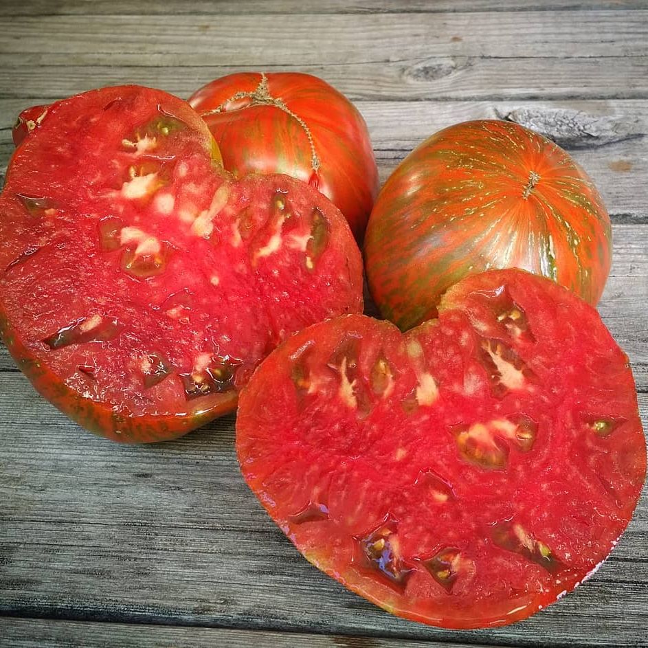 Girl Girl's Weird Thing- 10+ Organic seeds A variant of Green Zebra discovered by Jessica Hughes, Canada. Named after her dog Girl Girl because she would steal these tomatoes to eat. Extremely beautiful multicolored tomato, a mutation of Green Zebra. Gorgeous, dark red olive-skinned fruit with red/pink striping. The flesh is reddish-purple with intense sweet and mild flavor . Perfect for sandwiches, slicing and platters. Most of ours were large just under the 1 lb. mark. A favorite of Sebastien. Indeterminate Regular Leaf Mid-Late Season