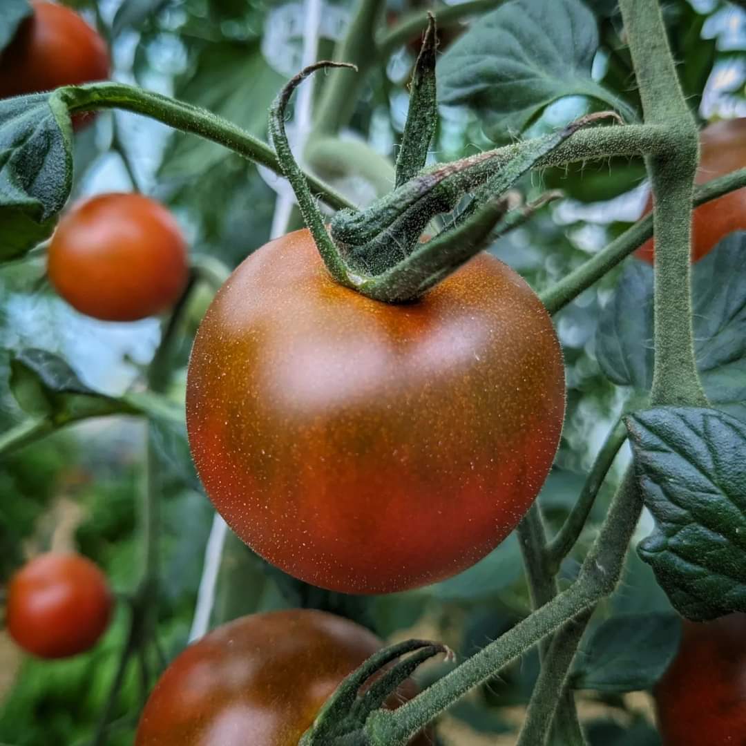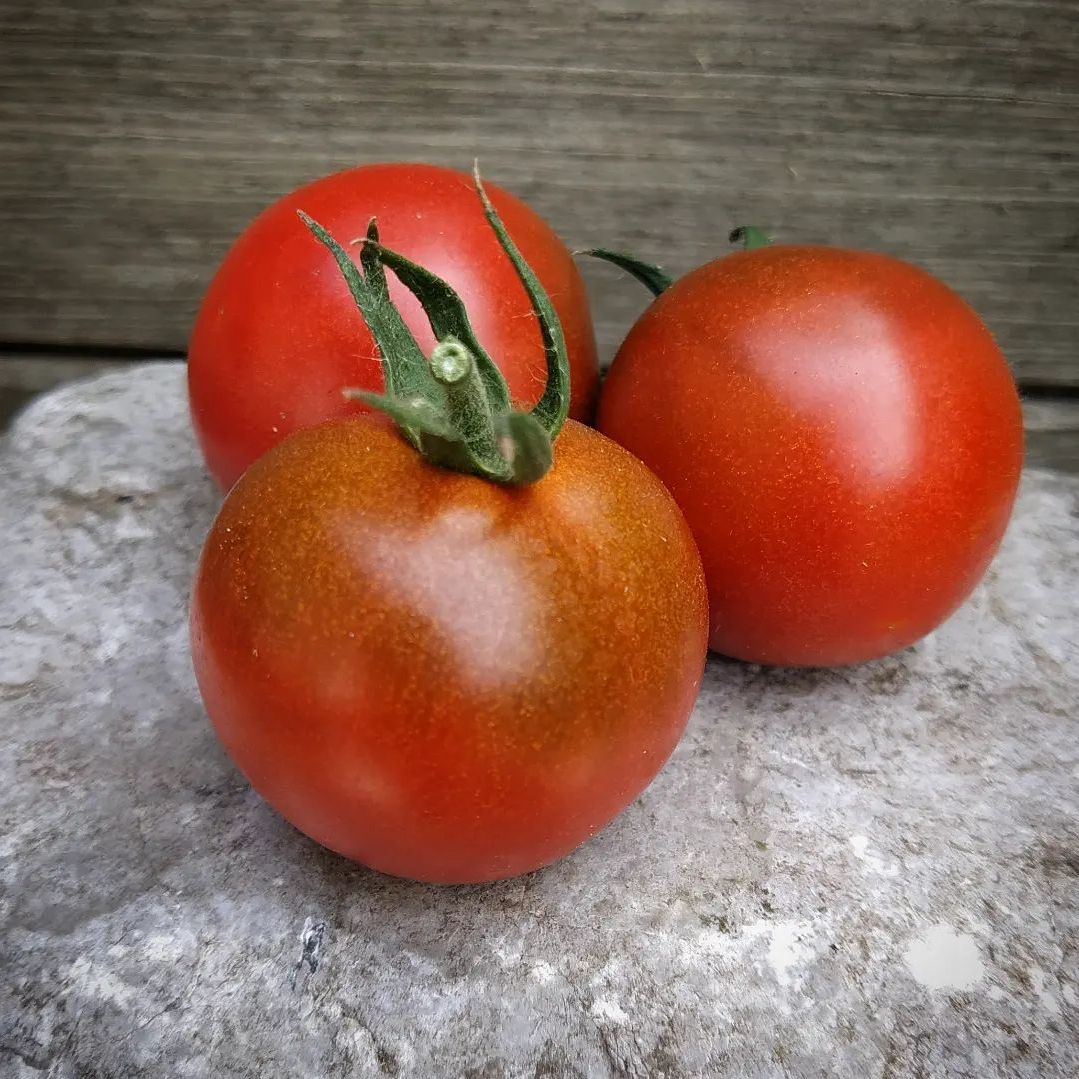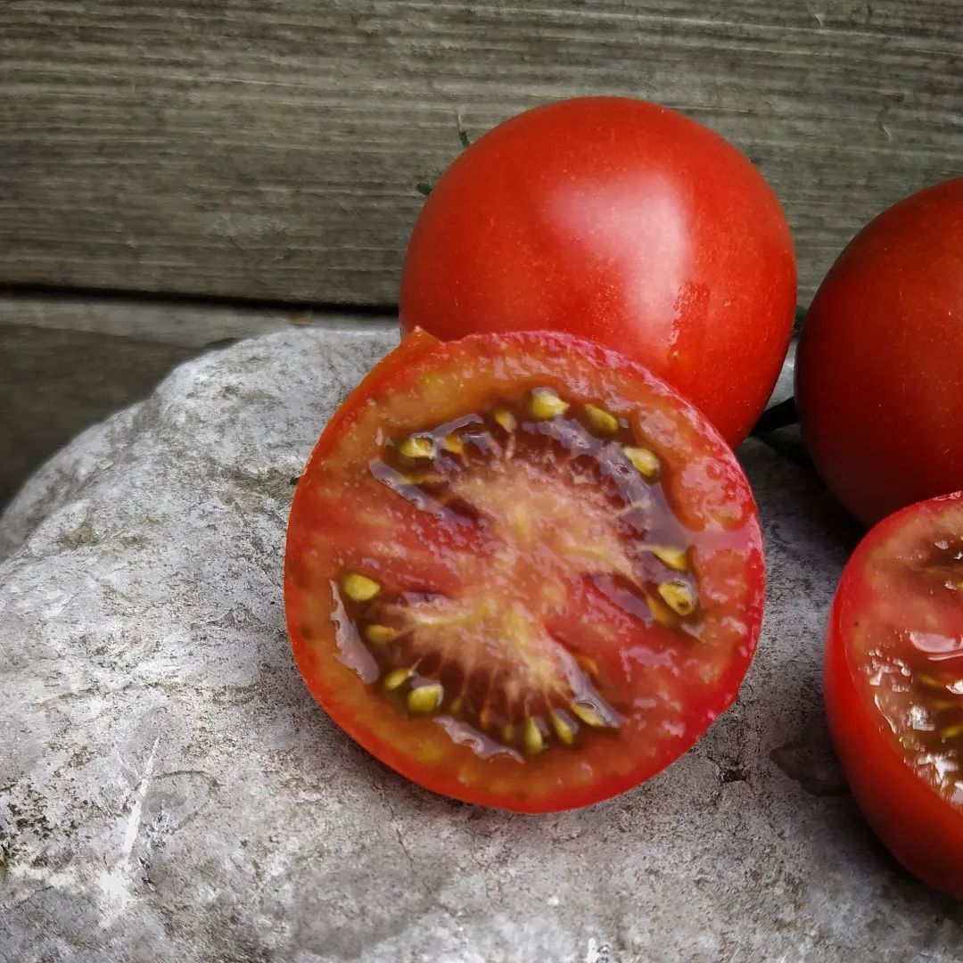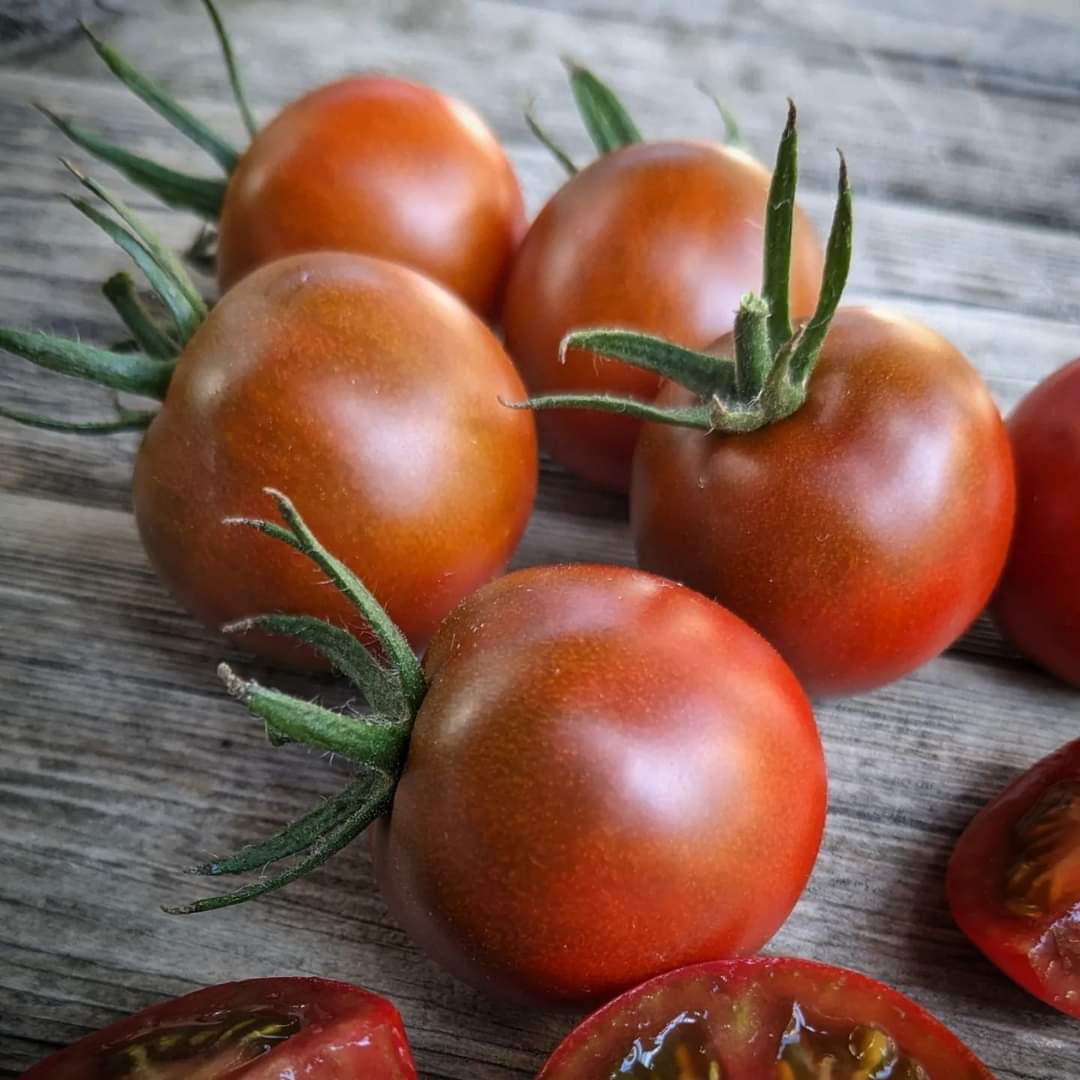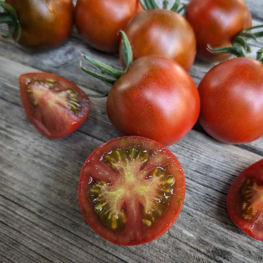 Hoosier Outlaw Black Cherry - 15+ Organically grown seeds Here we have another beautiful tomato from Bill Jeffers of Evansville, Indiana. Extra large, deep maroon colored cherries. We absolutely loved the large size of these and the flavor was extra also. Fruits are extremely crack resistant (even in our heatwave and drought of 2022 & 2023). Flavor is smokey and full. Extremely productive even during the 2023 heatwave. These refuse to crack! We will be growing it again next season. This season we will be offering the sister variety, Hoosier Outlaw Green Cherry which is super sweet and I love the coloring. Indeterminate Regular Leaf Mid-Season