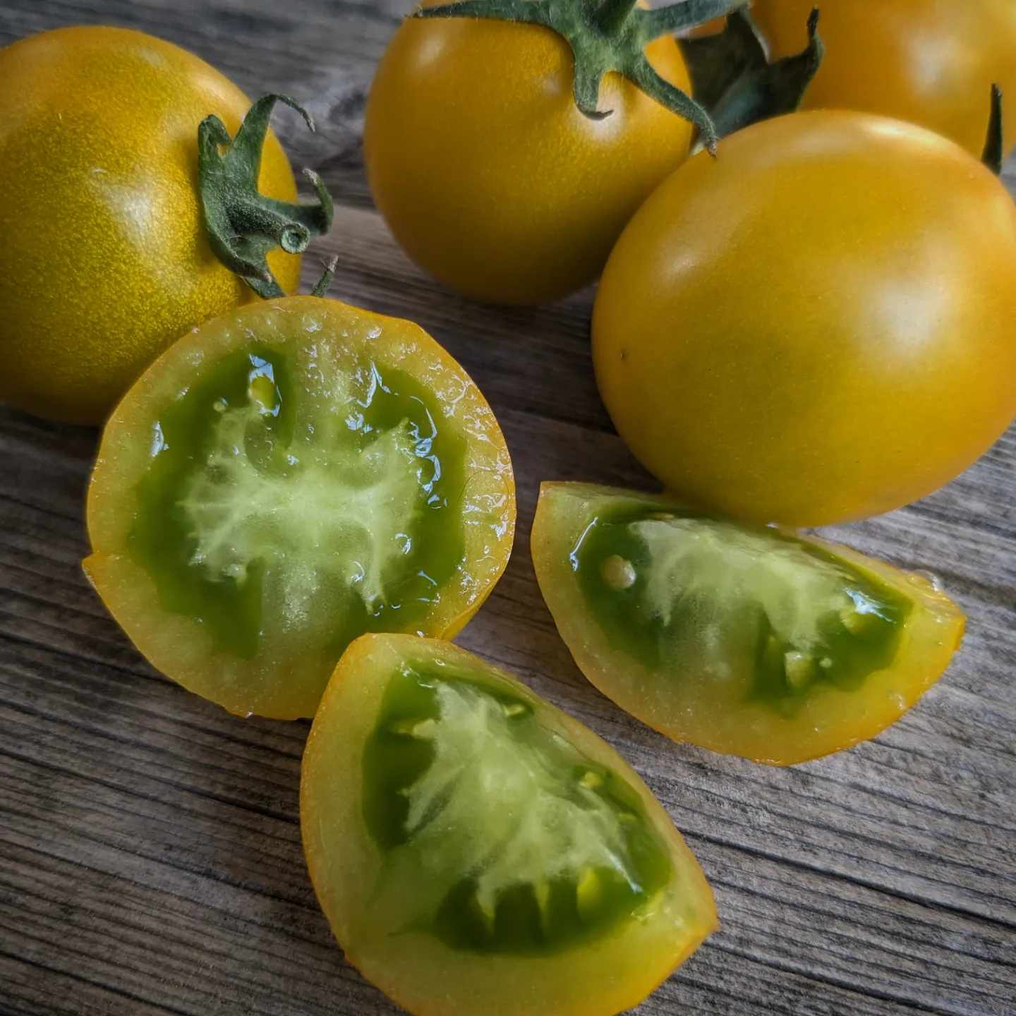 Hoosier Outlaw Green Cherry- 15+ Organically grown seeds Here we have the green sister variety of Hoosier Outlaw Black Cherry . Another beautiful tomato from Bill Jeffers of Evansville, Indiana. Extra large chartreuse colored cherries with lime green interior. We love larger size cherry tomatoes and this one especially. Very sweet. This was a top performer in our 2023 heatwave and even thrived. In spite of the heat, no cracking whatsoever and no loss of flavor. Such unique coloring it makes a salad look like artwork. We highly recommend this one for flavor and productivity. A winner! Indeterminate Regular Leaf Mid-Season