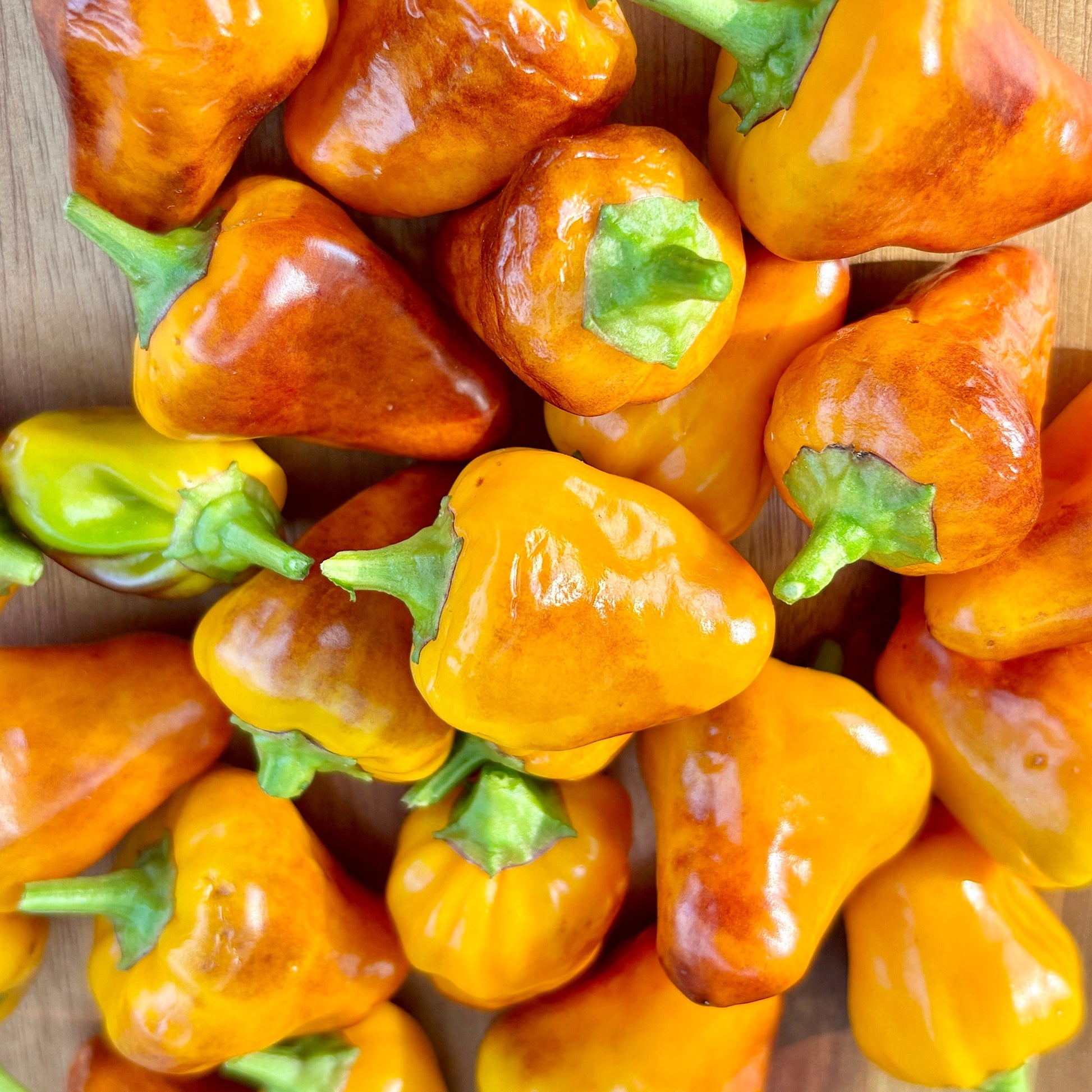 Color-shifting heat with garden flair. Bred by Jes Christensen, this unique jalapeño hybrid brings the drama with deep purple pods that ripen to a blazing orange, often displaying both colors at once in a mottled, fiery blend. It’s a cross between Black Jalapeño and 3-Color Cayenne, and the result is pure eye candy—with a kick.
