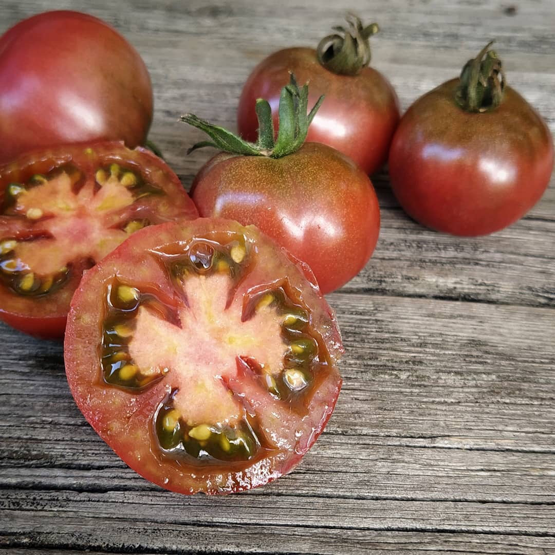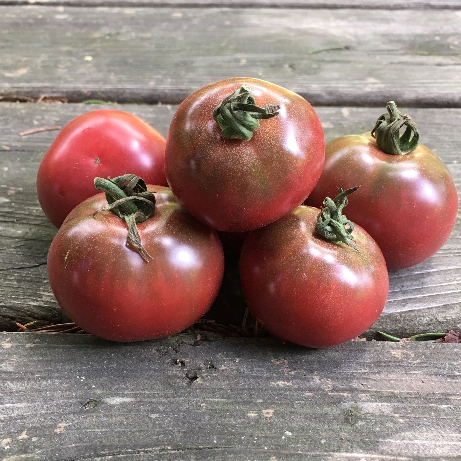 KARMA Purple is a potato leaf cherry, producing dark purple fruits. So sweet, we call them garden candy. Deep purple in color with the green shoulders often seen in purple/black tomatoes. It is very disease resistant and produced abundantly in our cooler region. Exceptional taste and resisted cracking. We highly recommend this new open pollinated cherry for those that want a sweet purple cherry and also save seed.