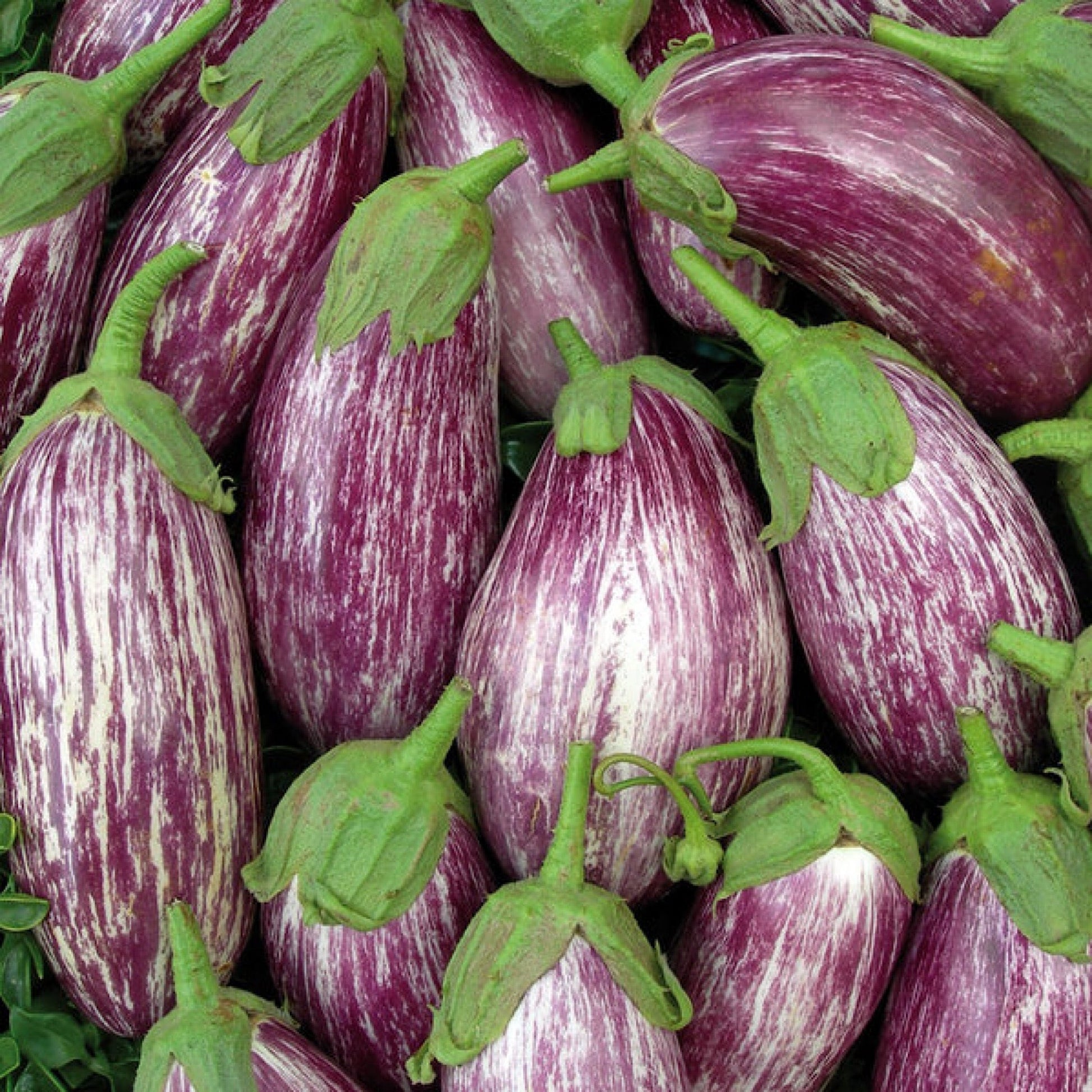 A true heirloom beauty from Spain, the Listada de Gandia eggplant is as striking as it is flavorful. This classic variety produces plump, oval fruits with creamy white skin streaked in rich lavender-purple—like brushstrokes on canvas. It’s a must-grow for gardeners who want both eye-catching color and gourmet flavor.