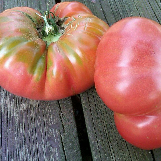 Huge pink beefsteak most weighing in at 2 lbs. Very few seeds and very meaty. Sweet tomato taste. Seed originally from deceased seed saver from West Virginia. Thought to originally been brought here from Lithuania. Big producer.