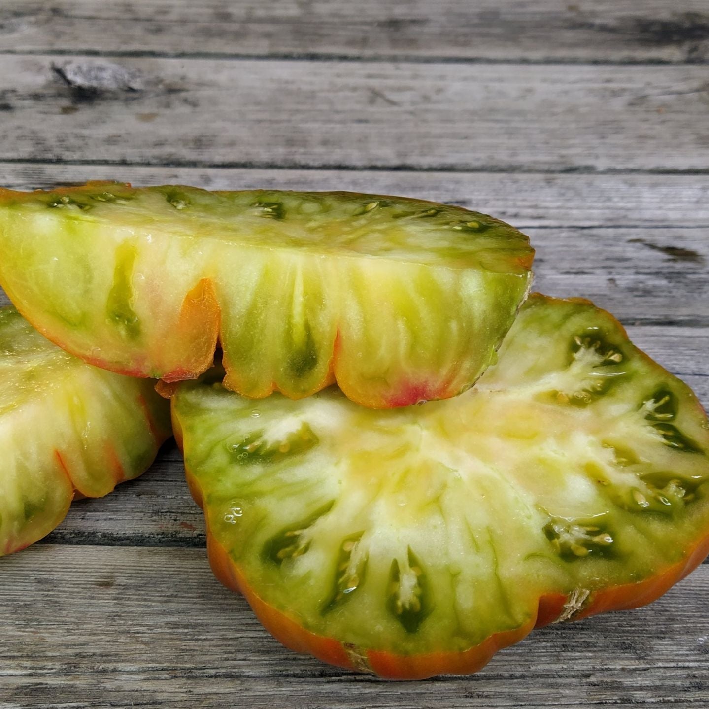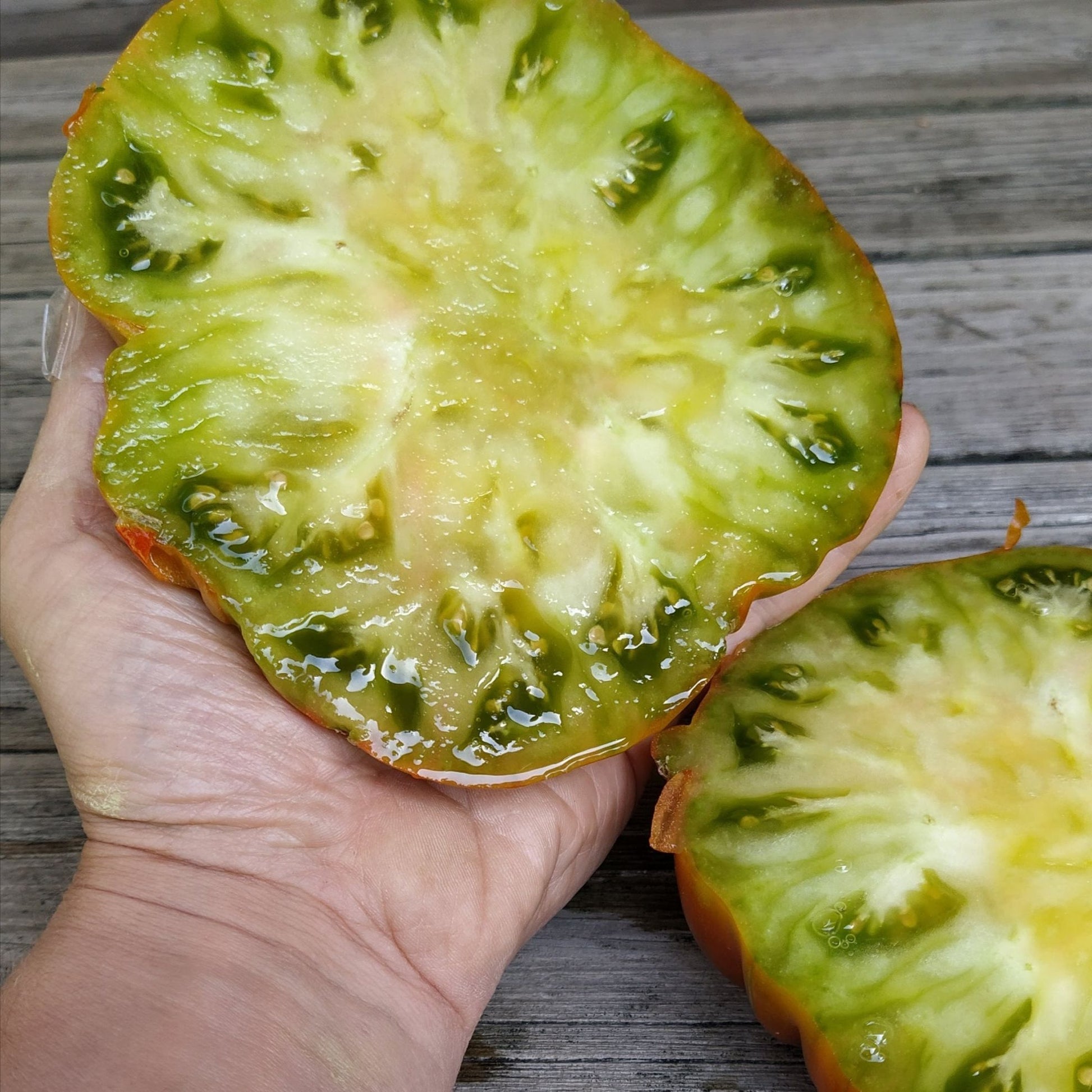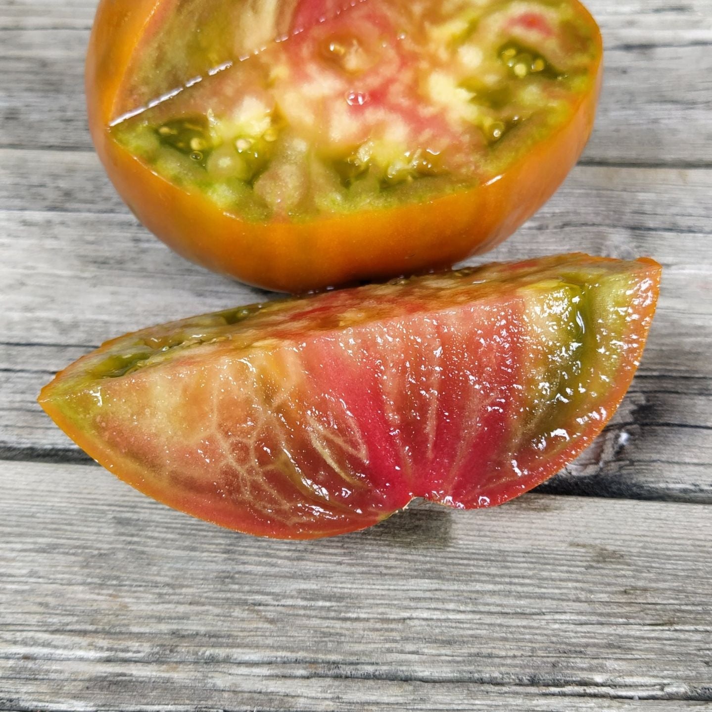 We think this one is not stable that is why you might see either the green or marbled interior. (see photos) Consistantly in the 1lb range and the taste is exceptional. We love this tomato. If you love large beefsteak tomatoes that cover your plate, this is a vigorous recommendation. Having this and Maple Syrup makes your tomato platter a work of art. Because this was grown from the same seed as Maple Syrup, we tagged it Mossy Oak to differentiate the 2 sisters. Indeterminate Regular Leaf Mid-Late Season
