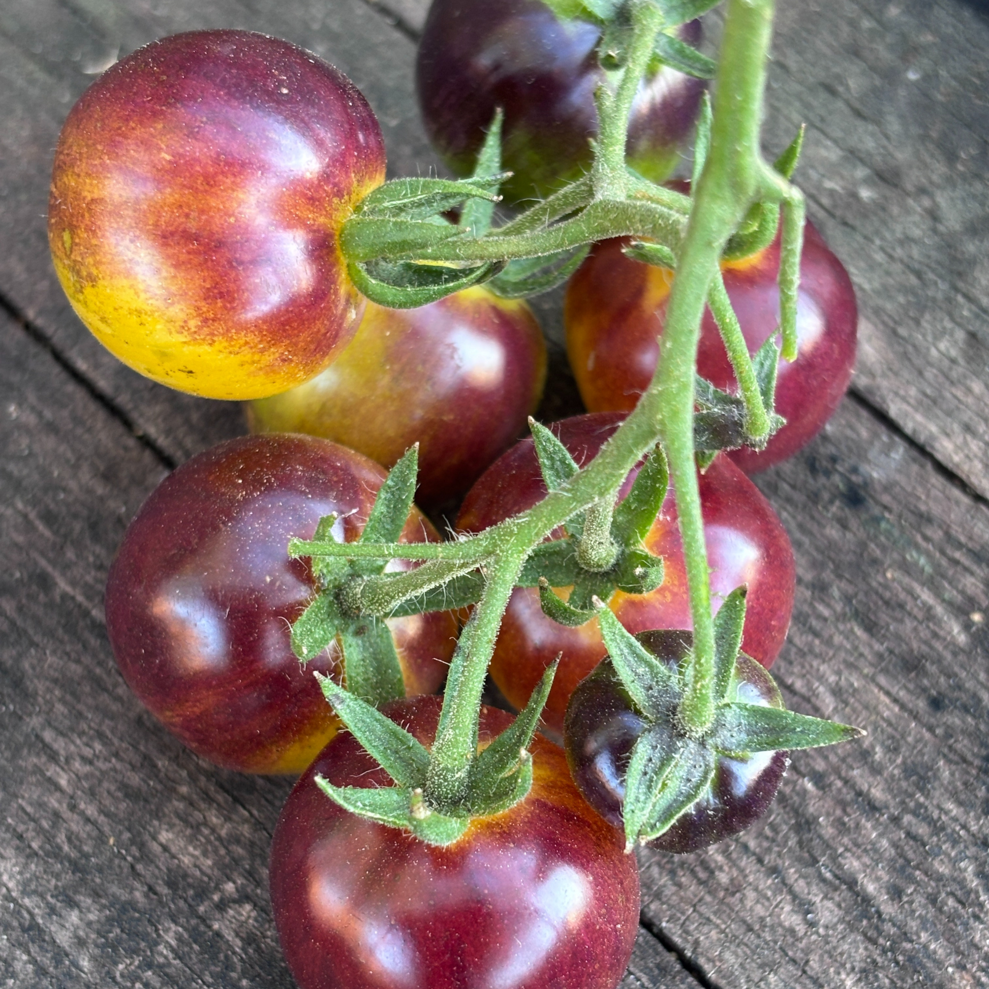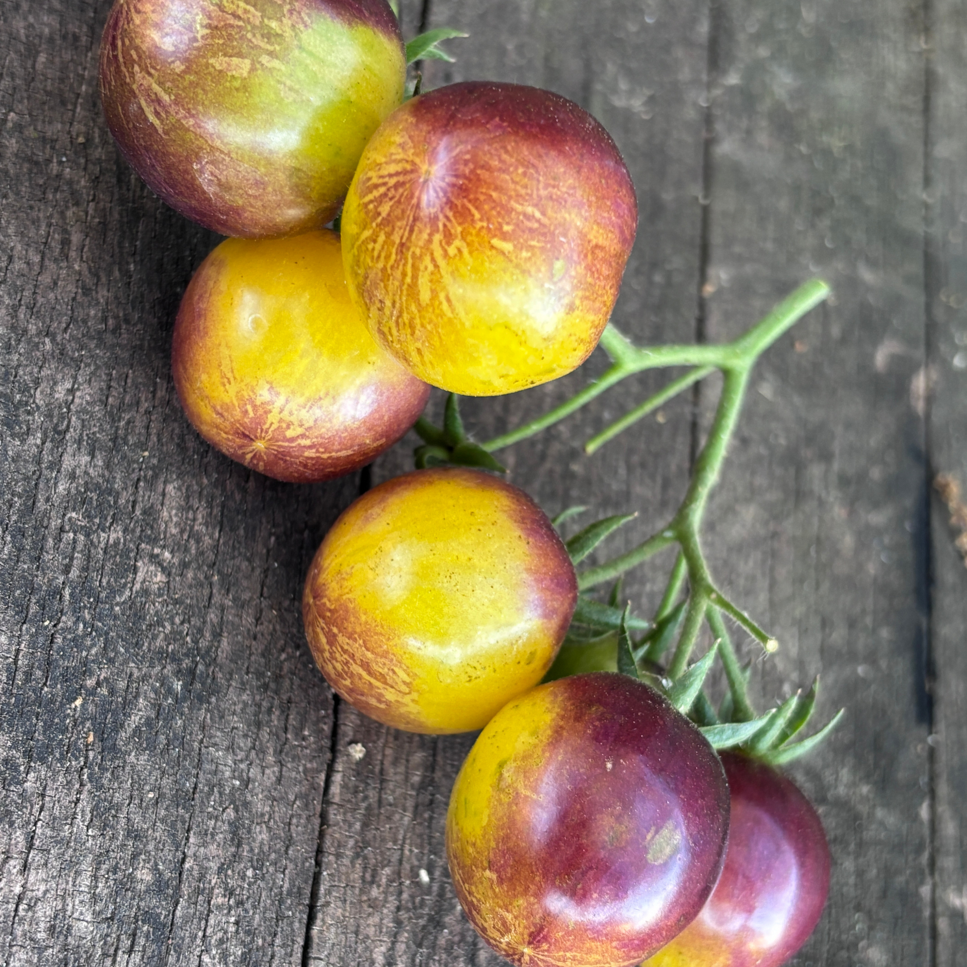 Steady, reliable, and full of soul—Never Let Me Down is a tomato you can count on, season after season. Bred by Georgia’s own Bill Yoder, this indeterminate variety delivers cherry-sized, perfectly round fruits in rich golden and purple tones with subtle striping and a glossy finish. The name says it all—this tomato shows up with flavor, vigor, and beauty, no matter the weather.