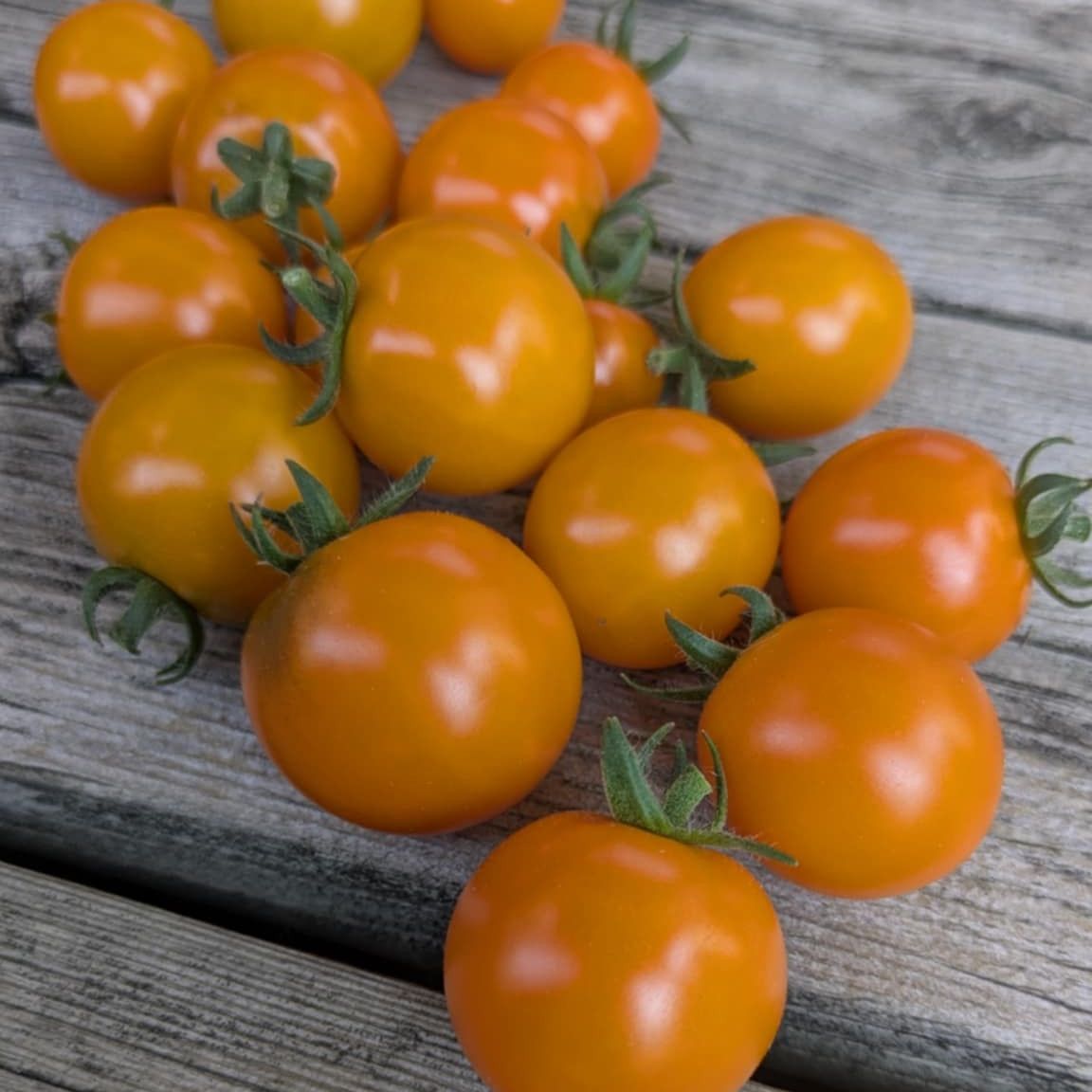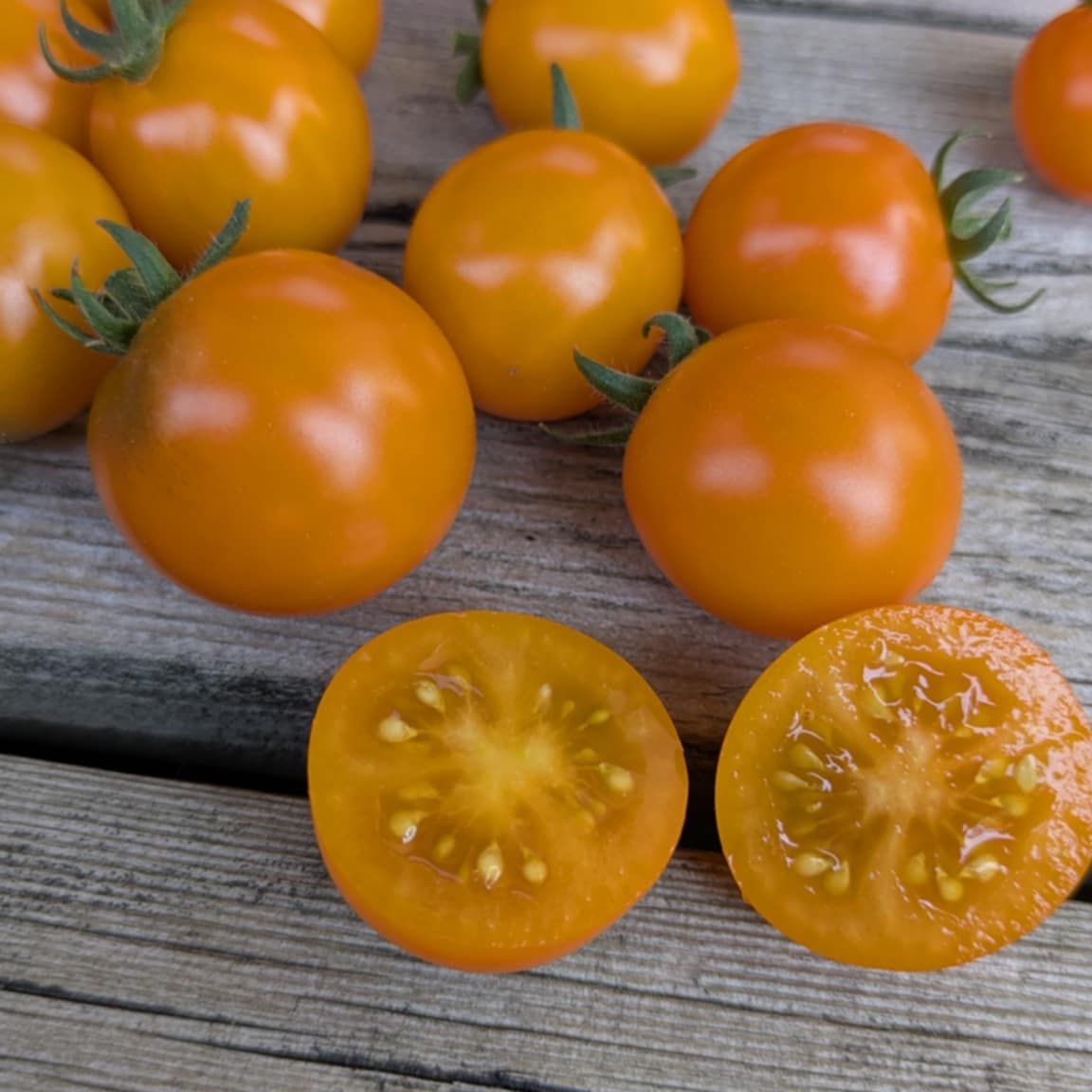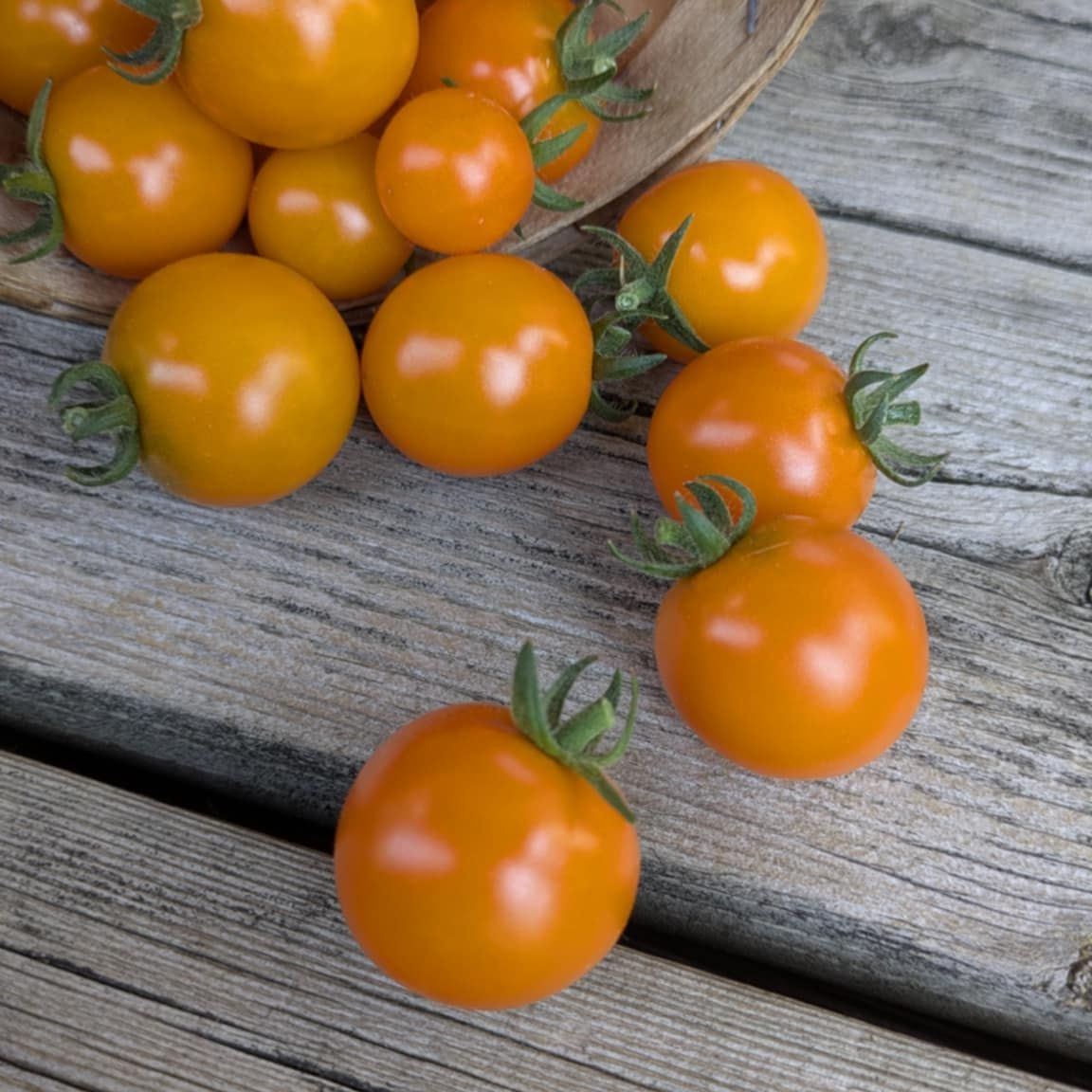 Orange Dream is brought to us by Sweden. It is said to be a rare variety. A micro dwarf tomato plant that stays around 9 inches tall, and produces an abundant crop of bright orange cherry tomatoes. Very vibarant color made by the same beta careteine pigment that is in carrots. One of our earlies varieties to produce.