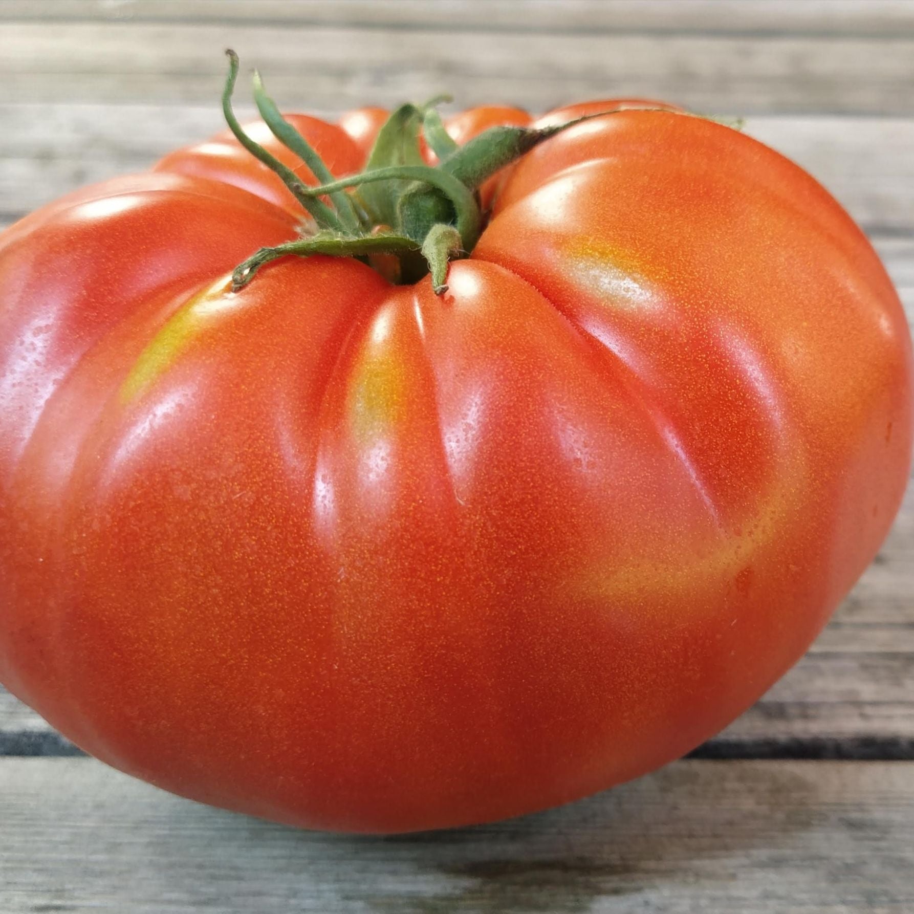 This big beautiful red came to me via a French friend that received it from her Portugese Father in Law that had been growing them for years. Large, crack free gorgeous beefsteaks with meaty interior with that old fashioned tomato taste. A must grow for me . Probably one of the best red beefsteaks we've ever eaten. Indeterminate Regular Leaf Late Season