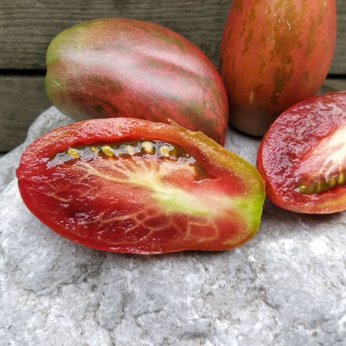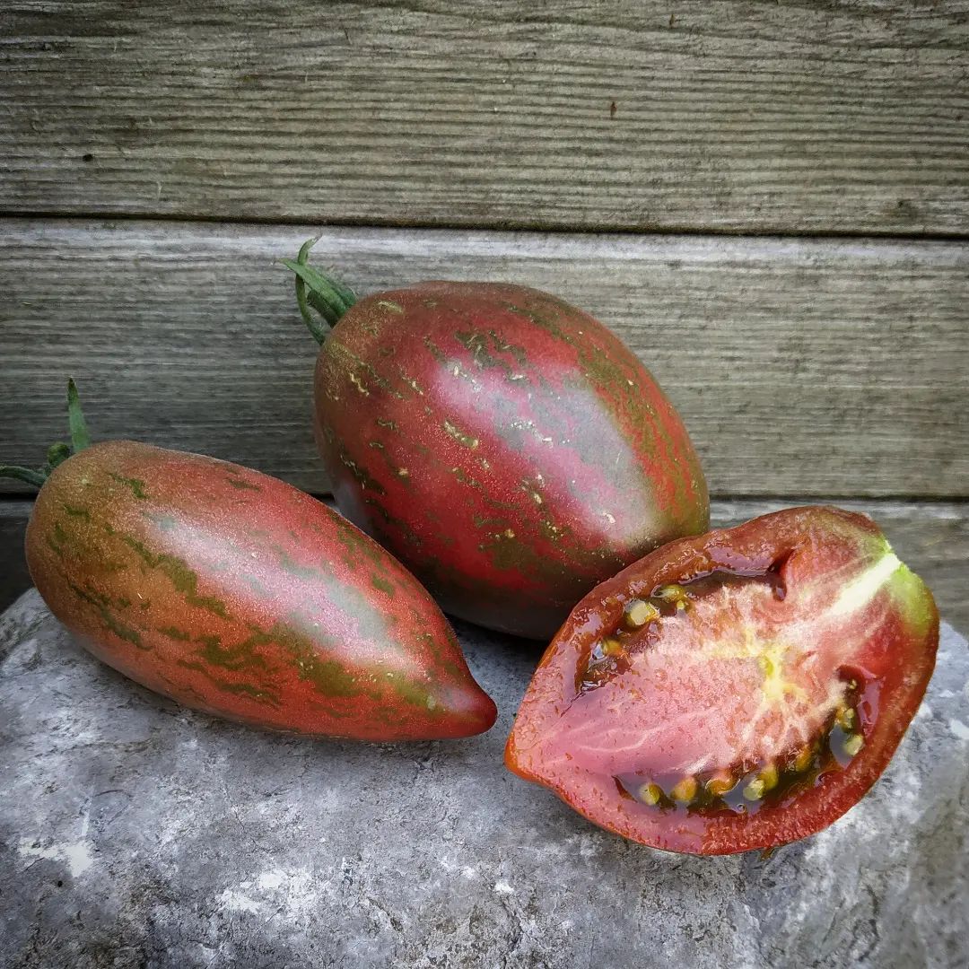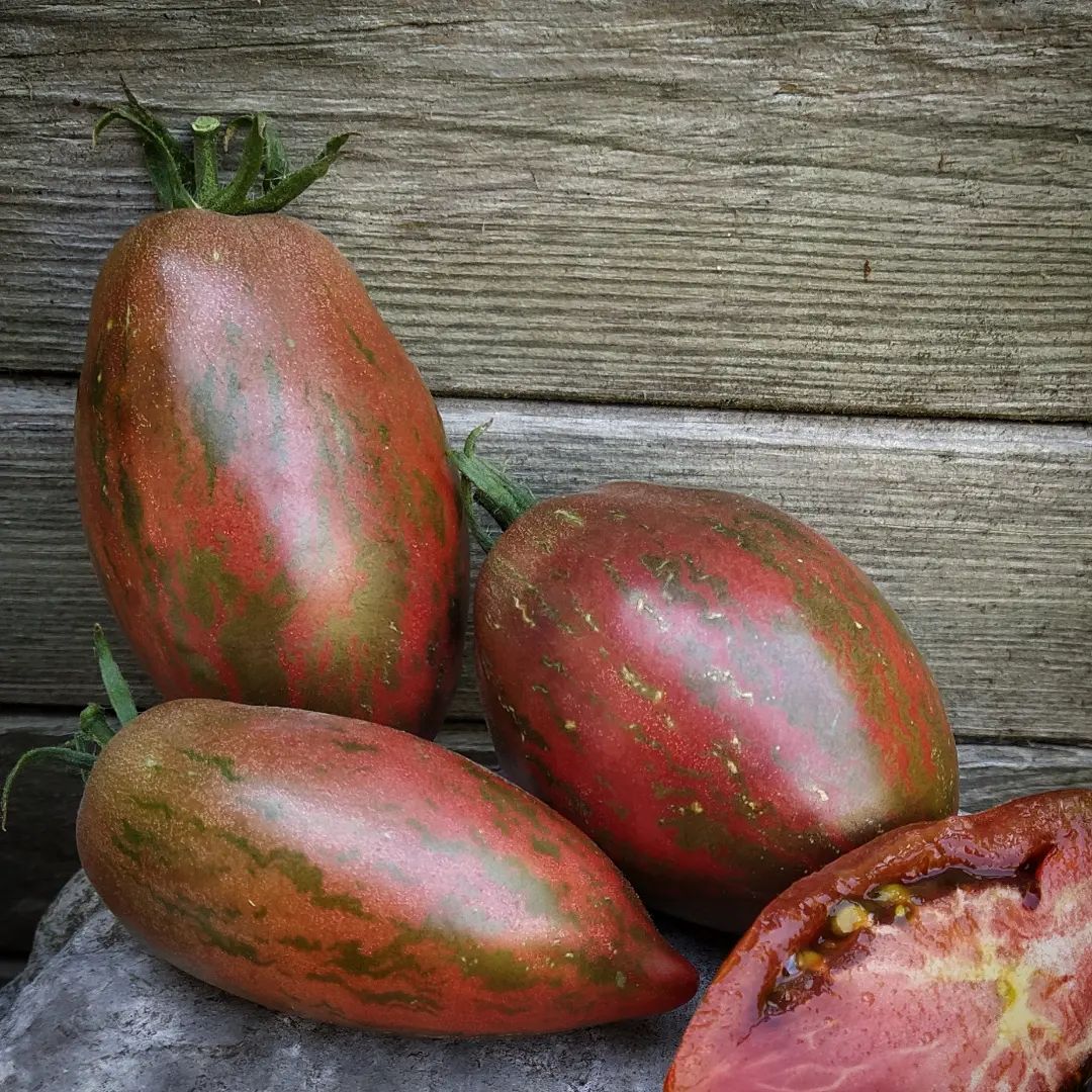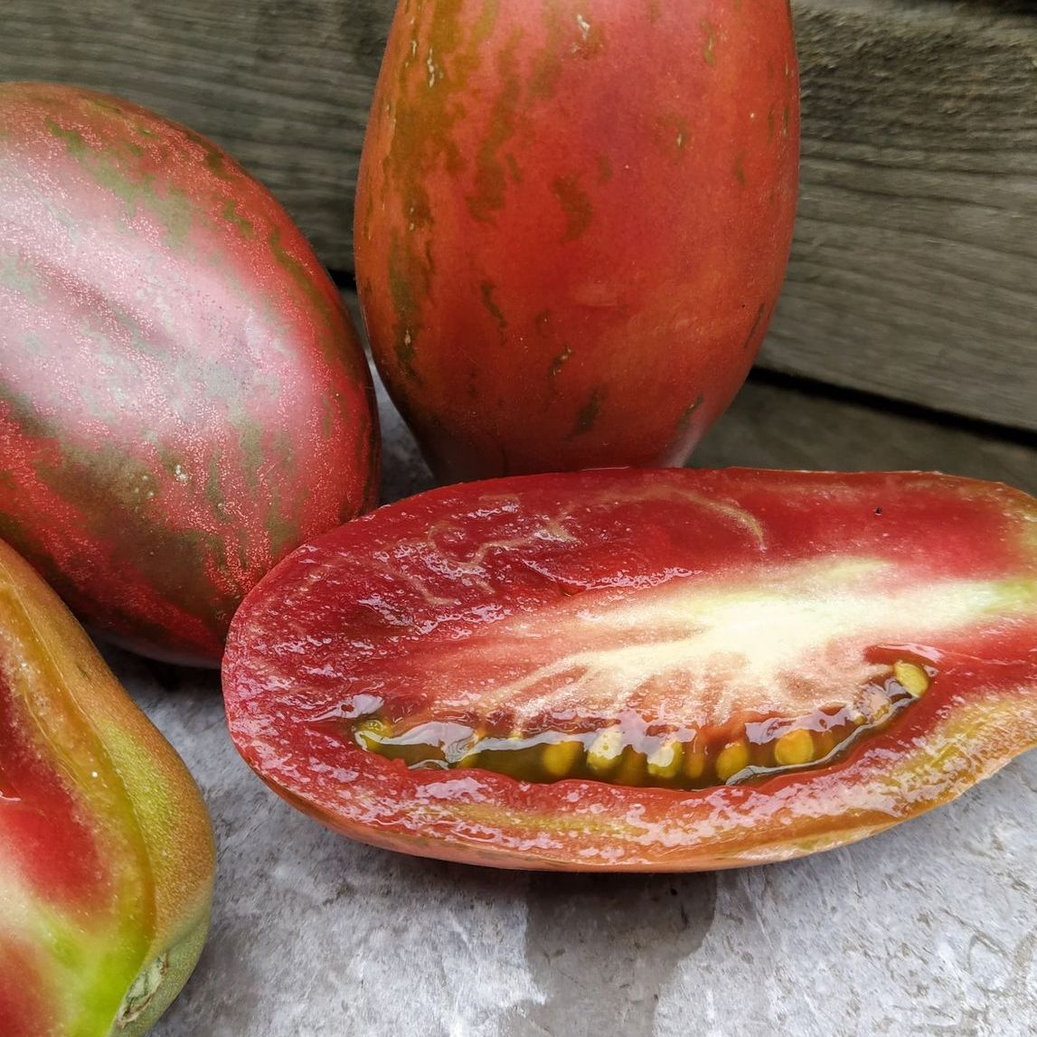 Sweet Tooth -10+ Organically grown seeds From Brad Gates, Wild Boar Farm,CA . 40 to 100 grams, (2-3 oz) elongated Roma type. Crimson pink streaked with metallic green stripes. Fleshy flesh with a rich and sweet flavor. Very good for fresh consumption but it is in the production of sauce or paste that it has the most potential, the latter proving to be rich and sweet. Very good mid-season production. Regular wispy foliage like most elongated or heart-shaped varieties. Very productive. Indeterminate Regular Wispy Leaf Mid-Late Season