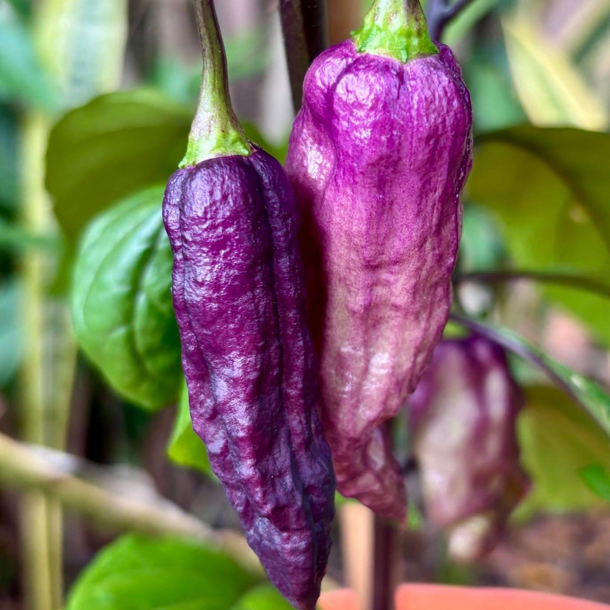 Snap-worthy heat and cosmic color. The Thanos Pepper is a wild and unstable hybrid born from a cross between Blue Ghost and Purple Phantom. Named after the infamous cosmic villain, this pepper delivers galaxy-tier fire and visual drama. The pods morph from deep, shadowy purple to a peachy-orange hue, often streaked or mottled with dark purple—like something pulled from a supernova.